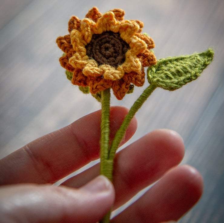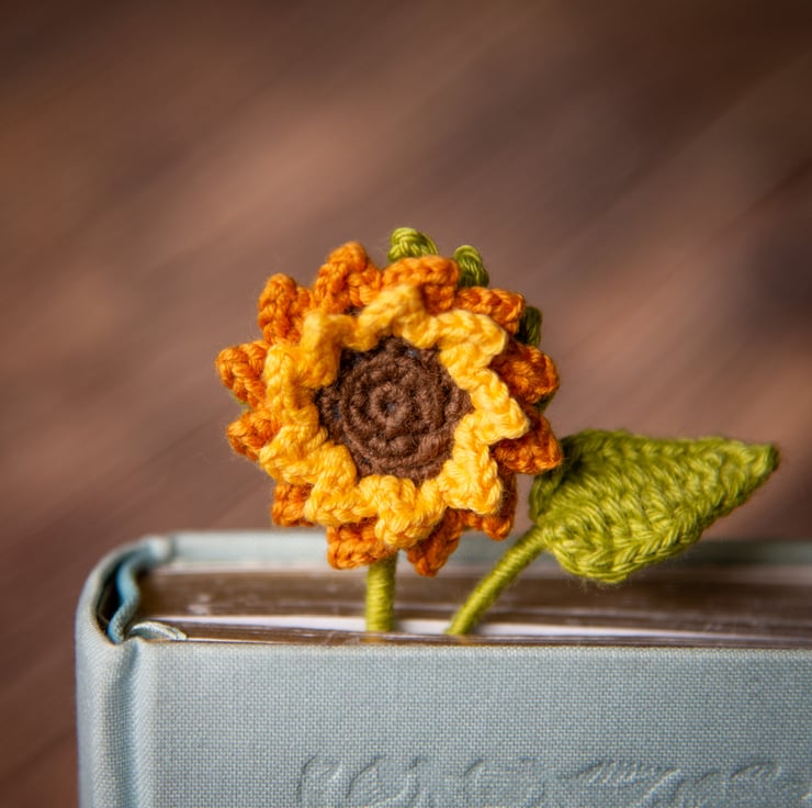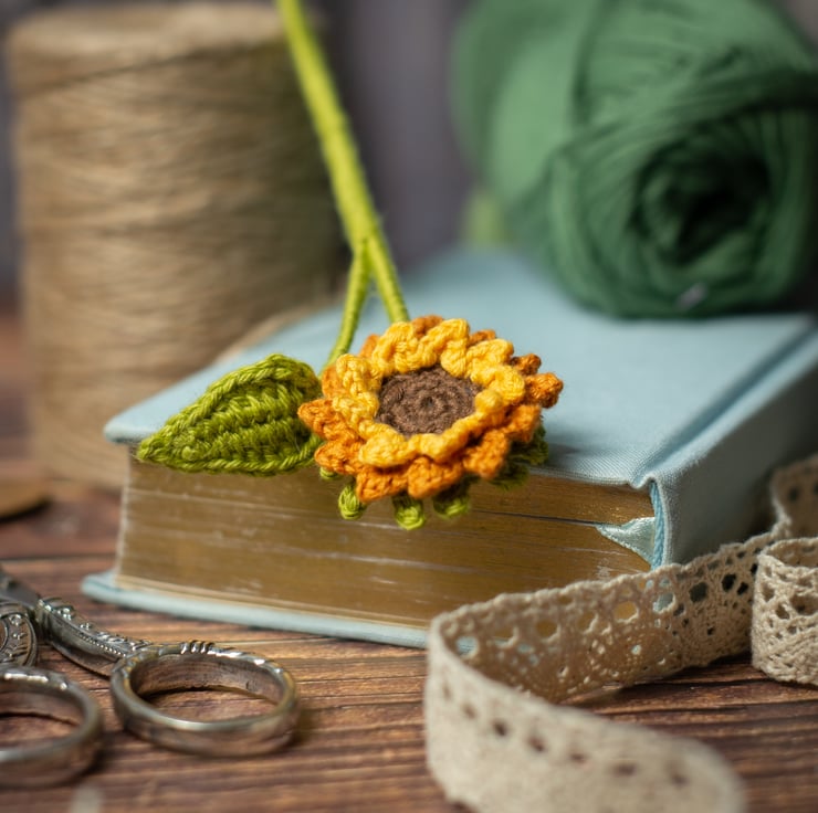 Sunflower Crochet Bookmark - a perfect gift for a book lover or a plant lover, someone of romantic nature, stationery fan or flower enthusiast. Can also be used as a decor item, it looks as good in a vase as it looks in a book. Sunflowers are widely recognized as symbols of positivity, happiness, loyalty, and adoration.