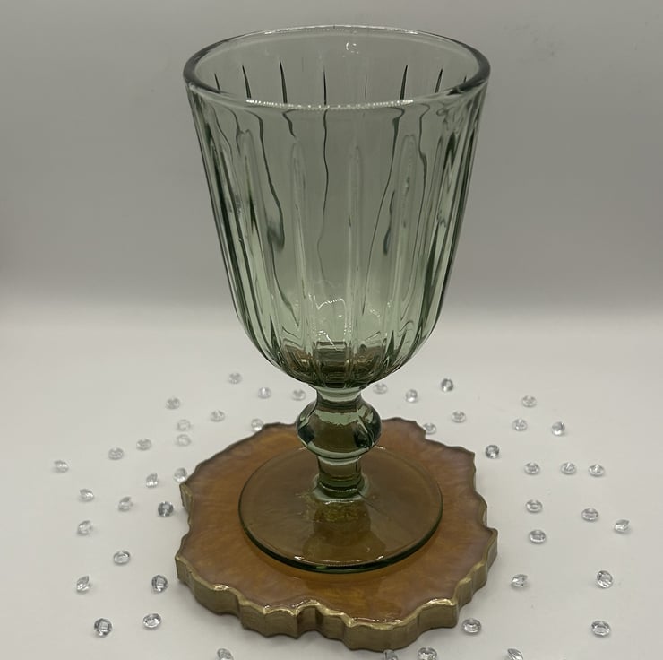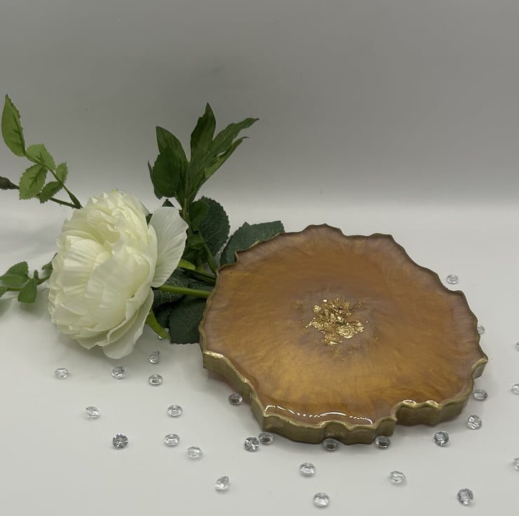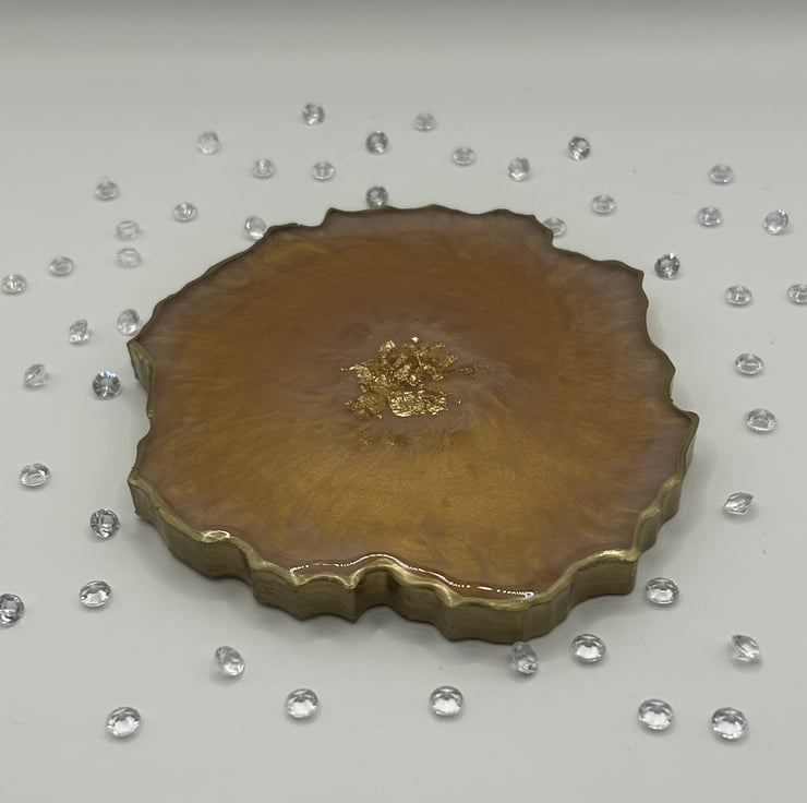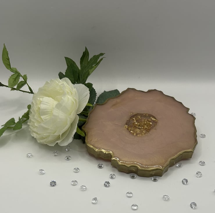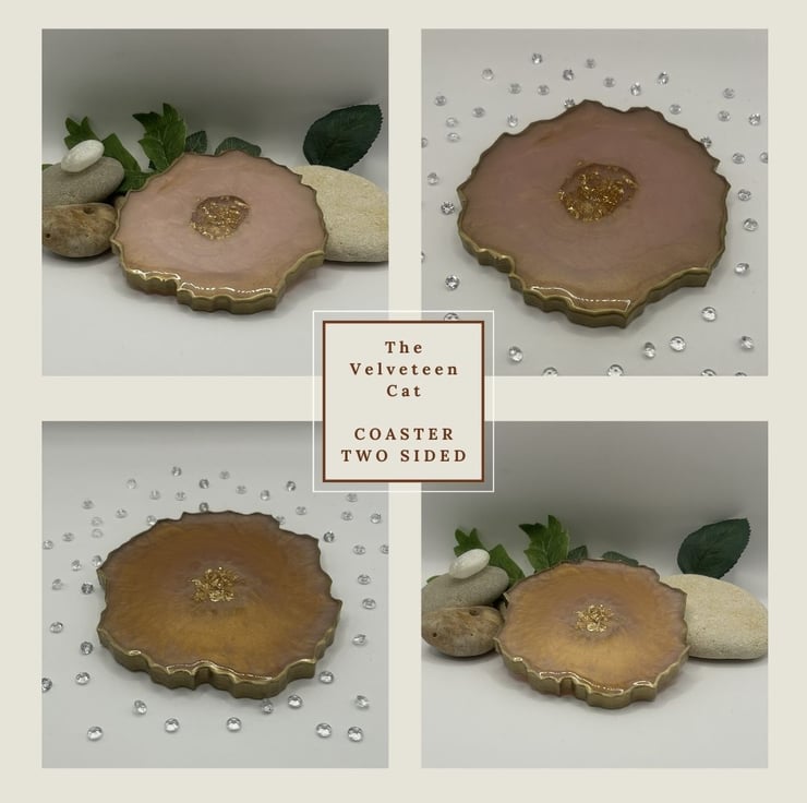 Made from eco friendly and food safe resin from a trusted UK suppler. This coaster really has to be seen to get a true appreciation of it's beauty. This is a double sided coaster, on one side is a mesmerising gold with just a hint of pink peeping through. On the other side, the lustre of the subtle pink has gold trails swirling around. In the centre sits a nest of gold leaf and chipped glass and the whole thing has been edged in gold. Perfection! If this coaster could speak it would tell you it was elegant and sophisticated whether it had an exquisite champagne flute, delicate wine glass or a mug of tea!