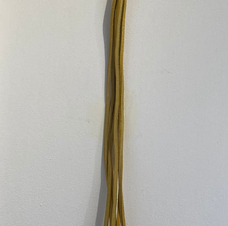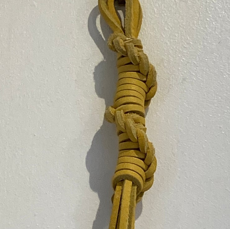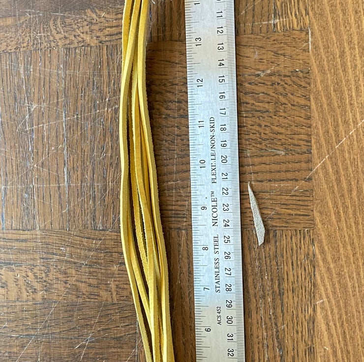 Handmade yellow latigo laced whip (length is 15” from bottom of handle - see above photo next to ruler). Handle is a hand wrapped ‘Chinese staircase’ design in the same yellow latigo lacing. Loops are left on top of handle for easy storage and hanging (as shown above).