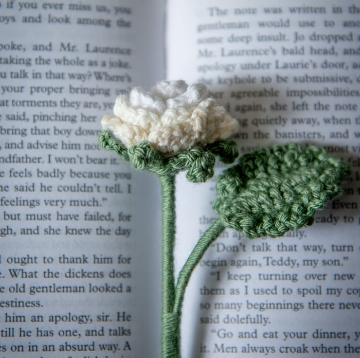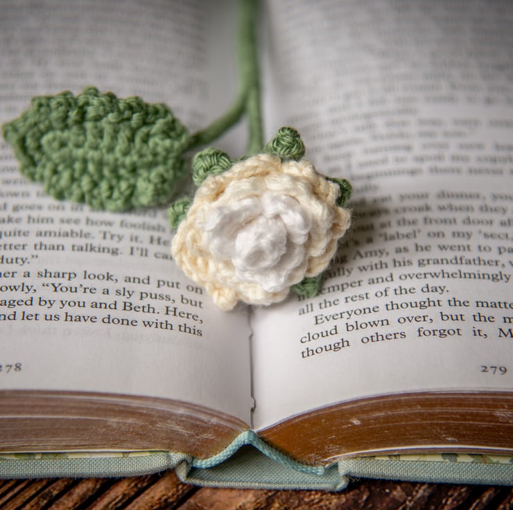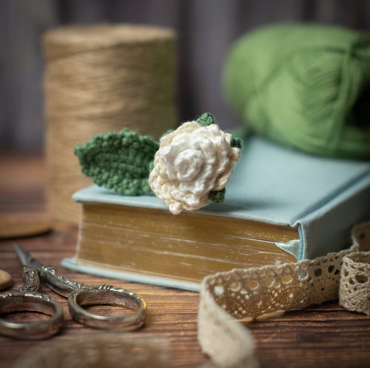 White Rose Crochet Bookmark - a perfect gift for a book lover or a plant lover, someone of romantic nature, stationery fan or flower enthusiast. Can also be used as a decor item, it looks as good in a vase as it looks in a book. White roses symbolise purity, youthfulness, innocence, young love, and loyalty. Roses are also June Birth Flowers.