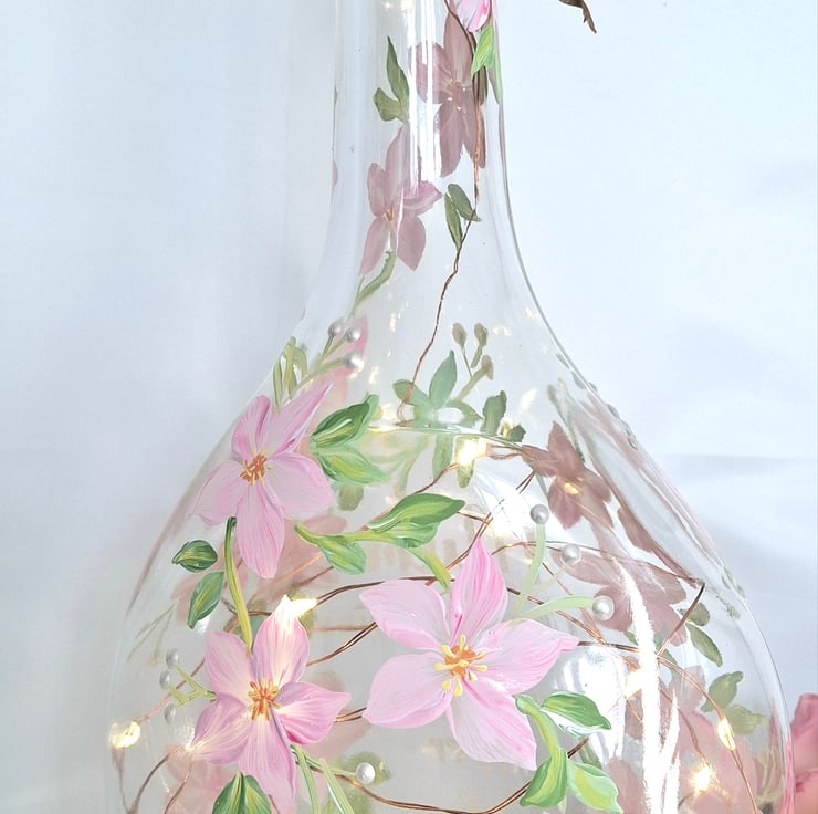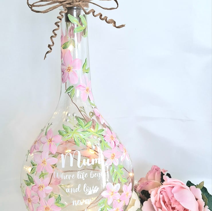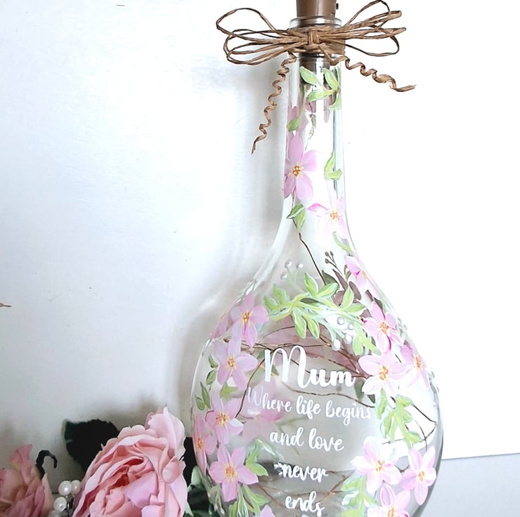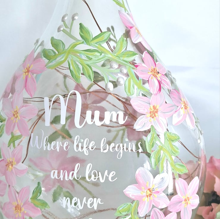 A sofly rounded glass bottle hand painted all around with a beautiful blossom flower design and featuring a lovely verse for your special mum. Perfect for her birthday or for Mothers day. The bottle has a string of battery operated LED lights with a cork shaped top.