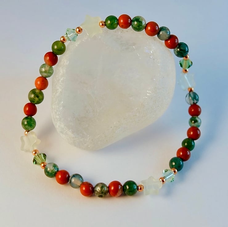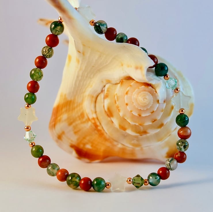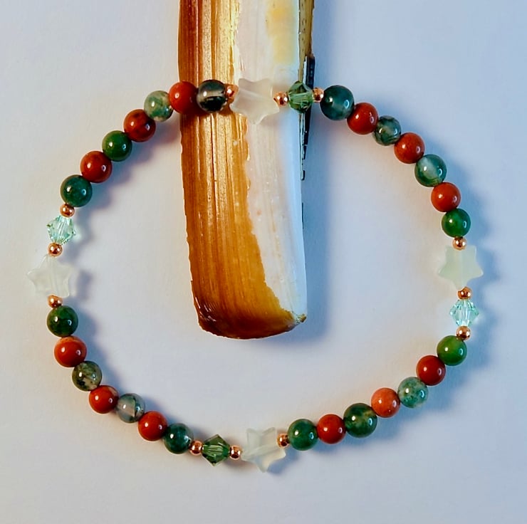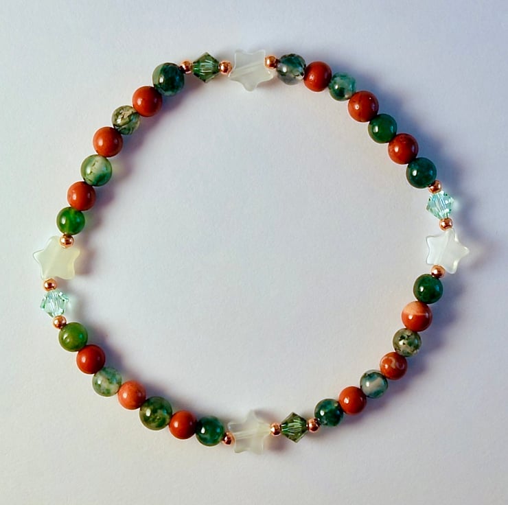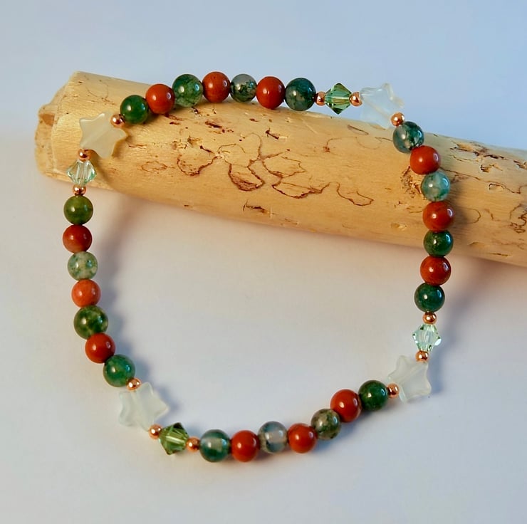 I have alternated beads of Moss Agate and Red Jasper, embellished with four 6mm pale green Jade stars and 4mm sparkly Austrian crystals in a colours called 'chrysolite' and 'peridot satin'.