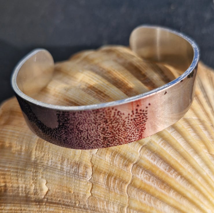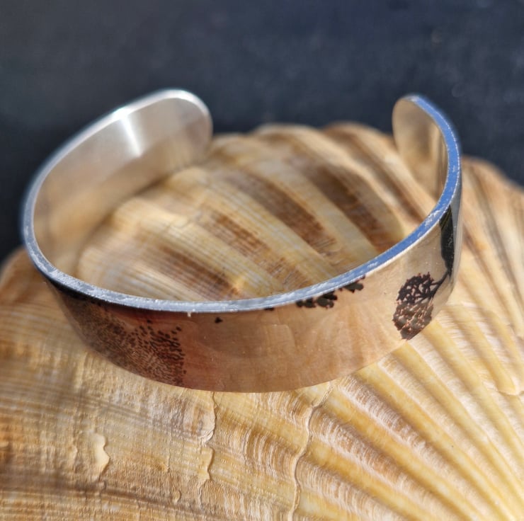An aluminium cuff bracelet, approx 16mm in width. A print of an original artwork by Hannah MacIver has been transferred on to the aluminium, and then is sealed with a coating of UV resin.