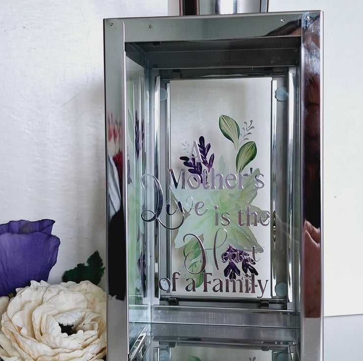 This silver lantern has been hand painted on all 3 sides with a stunning white lilly design with purple and green accents. It has a lovely quote on the front about a Mothers love being the heart of the family. The lantern is suitable for pillar candles or fairy lights. A really wonderful gift to treasure.