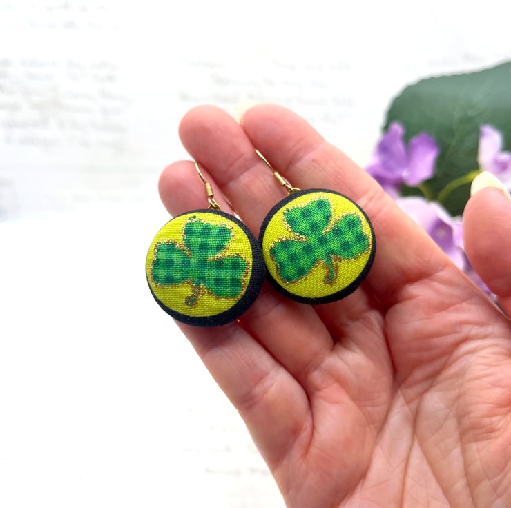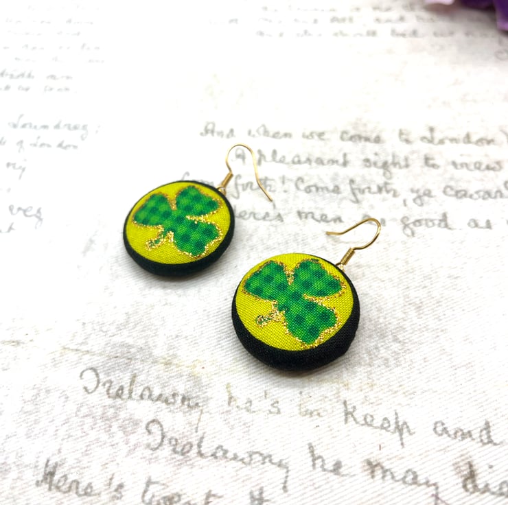 Authentic Irish-Themed Design - Luxurious fabric-covered buttons showcasing traditional shamrocks with striking gold glitter outlines