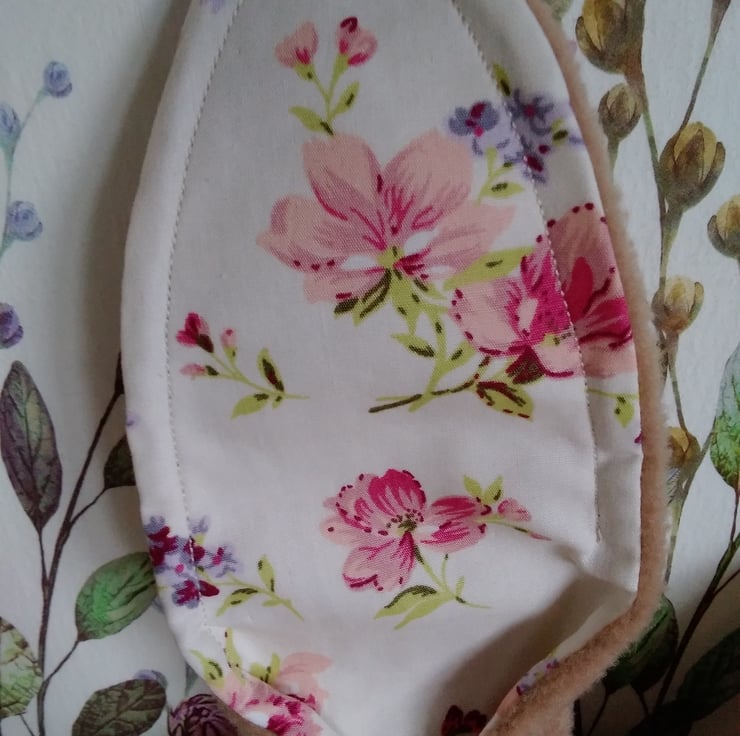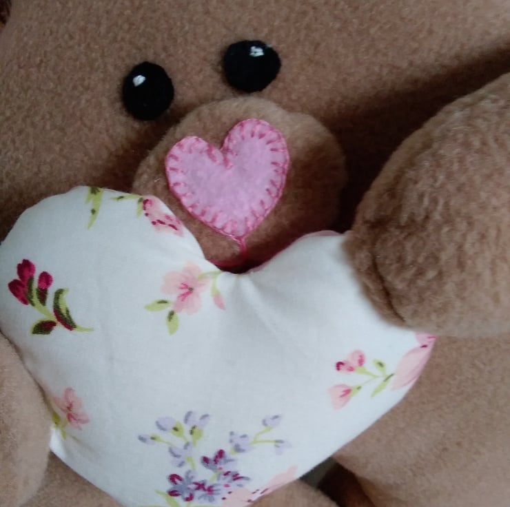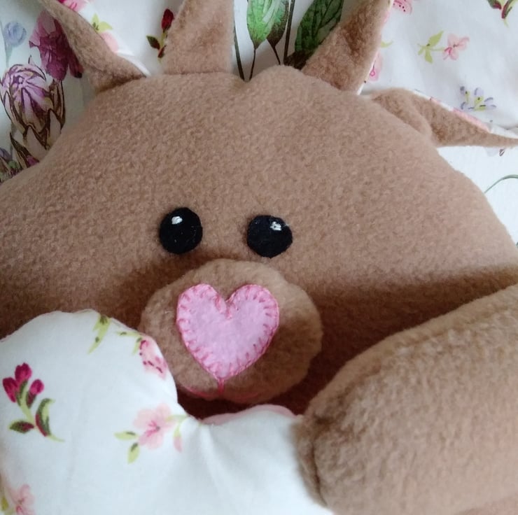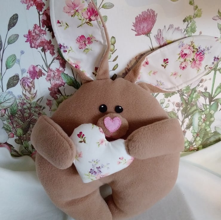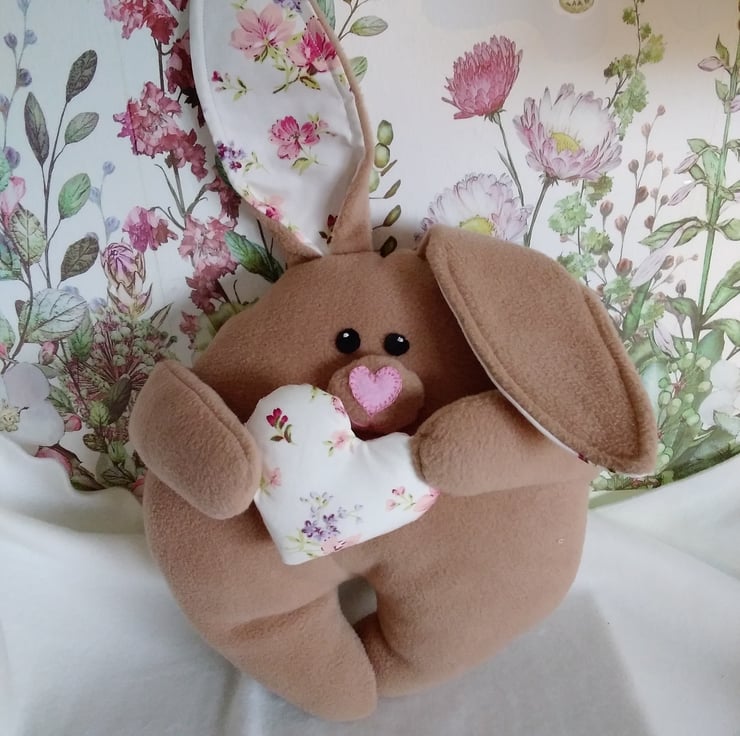 This cute bunny rabbit is sewn using anti- PIL fleece and stuffed with toy filler to make a squishy soft toy. The long ears have a pretty cream and pink floral inner, the eyes are black felt with white embroidery floss and the little heart shaped felt nose has embroidered stitching added around it. To make it even cuter, the bunny is holding a heart in the same cream and pink floral fabric.