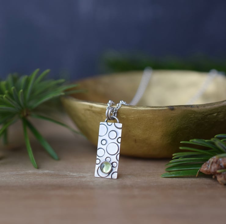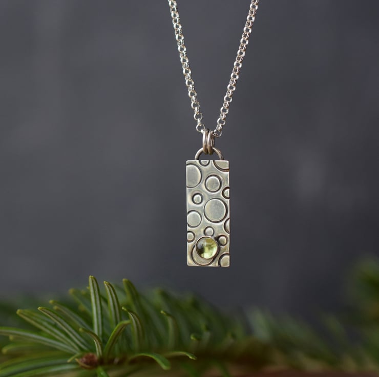 Handcrafted in solid sterling silver, the pendant features a hand-pierced (cut) rectangle shape which has been textured with metal stamps to create a bubble-like pattern. A 4mm peridot stone is set on the bottom to add a dash of colour, before oxidising to add depth of colour and polishing back to a shine. The design is suspended from a sterling silver chain in your choice of length.