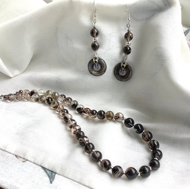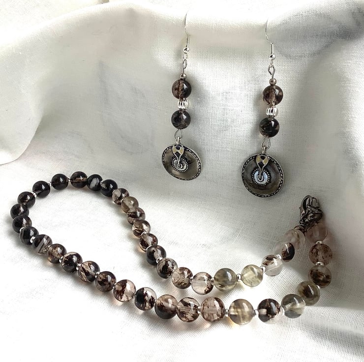 Matching dangling earrings: Quartz, up cycled metal earring disc, silver coated fish hooks