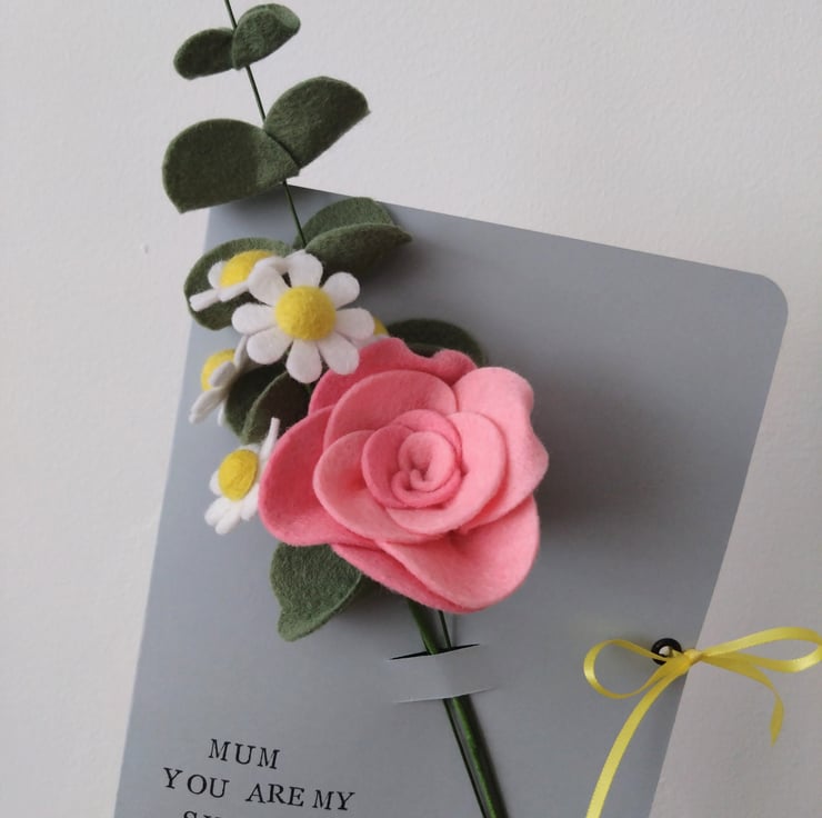 These handmade cards are very sweet and the flower can be kept for many years. The flowers in this arrangement include pink rose, spring of eucalyptus and spring of chamomile with five blooms.