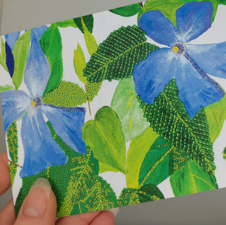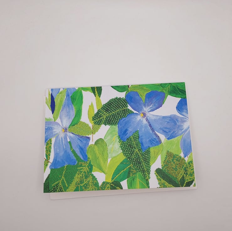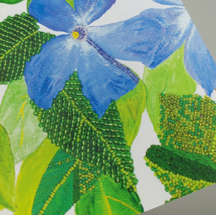 The Periwinkle Flower design is a combination of acrylic painting, beading, and stitching, making each card a unique, handcrafted keepsake.