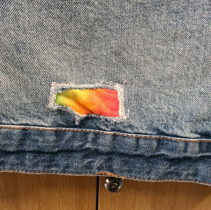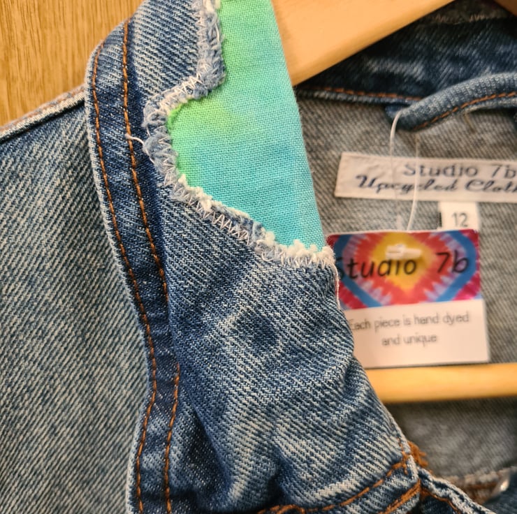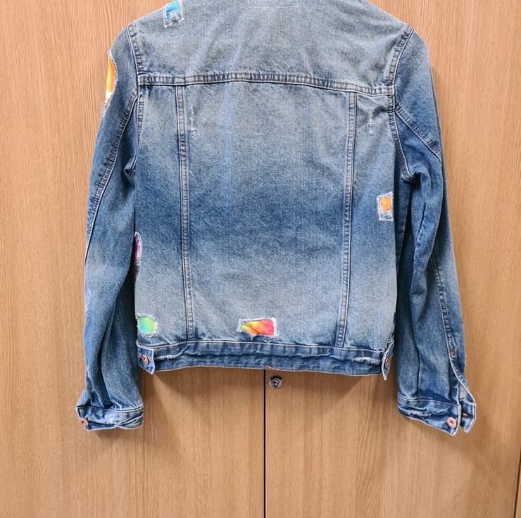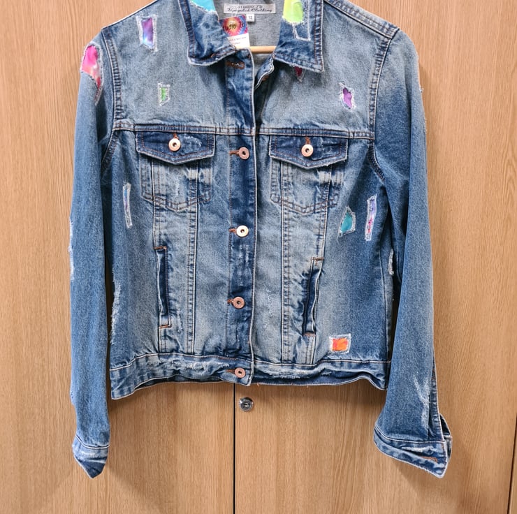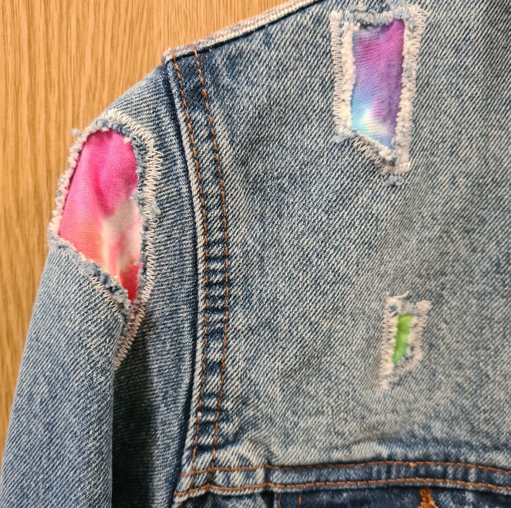 An upcycled denim jacket that has the holes repaired with tie dyed fabric. Size 12