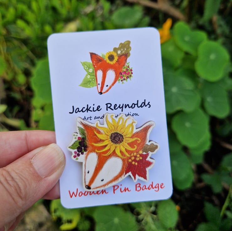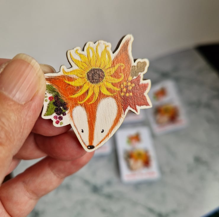 Cute Sunflower Fox, Wooden Pin Badge / Brooch