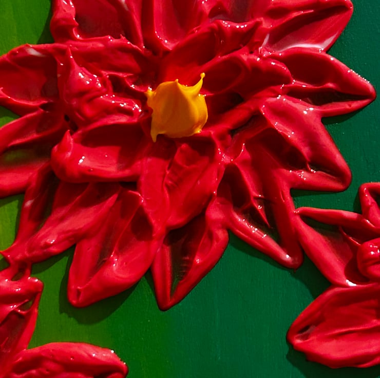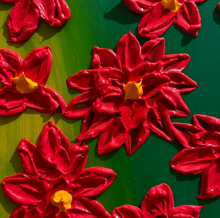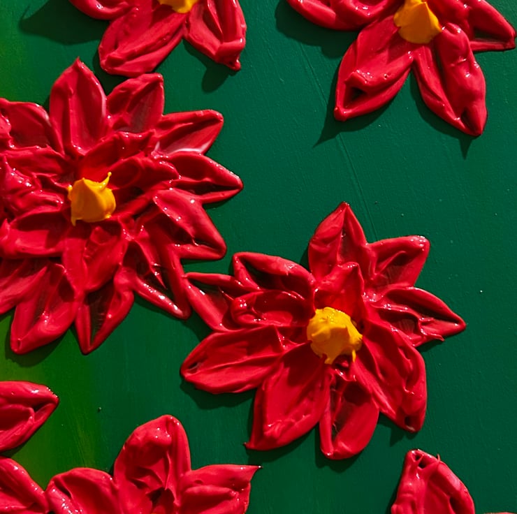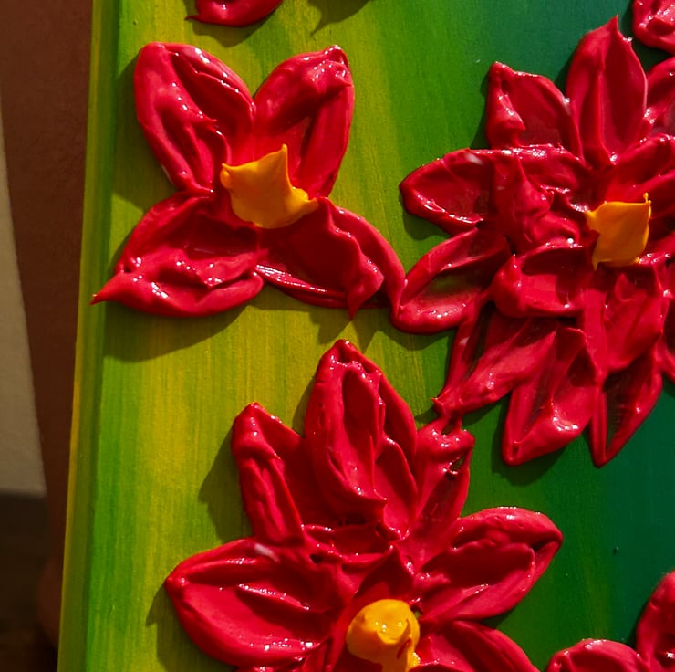 Panel was painted with a green and yellow slightly blended together. I then mixed a vibrant red full bodied professional acrylic paint with a heavy gel gloss to create a thick, textured painting. I created flowers to bring a burst of joy to your room. Lastly varnished for a shine and protection.