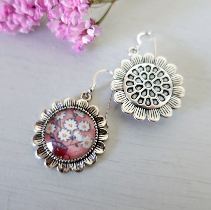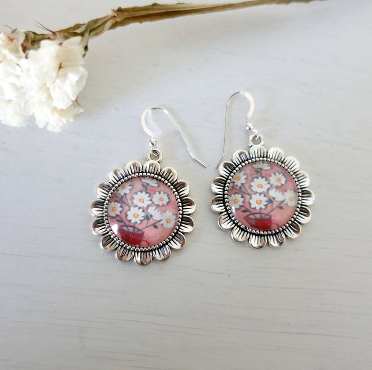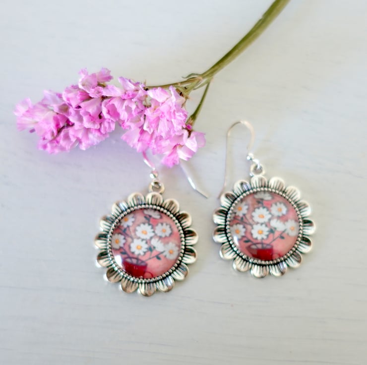 These pretty earrings are made using art prints after one of my original still-life paintings to create a unique pink accessory for ladies who like colours, flowers, nature and one-of-a-kind jewellery. Every piece I create is unique so the recipient will feel it was created especially for them. The art print is fixed onto a floral ornate setting made of stainless steel non-allergenic metal and fixed under a glass cabochon. The setting is approx 1.5" round and the drop is 2", including the sterling silver hook.