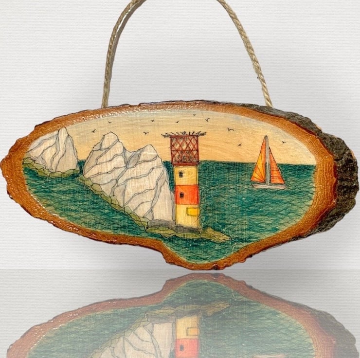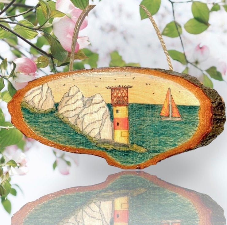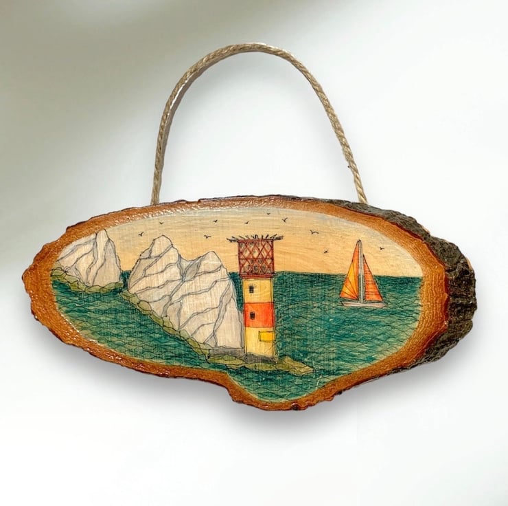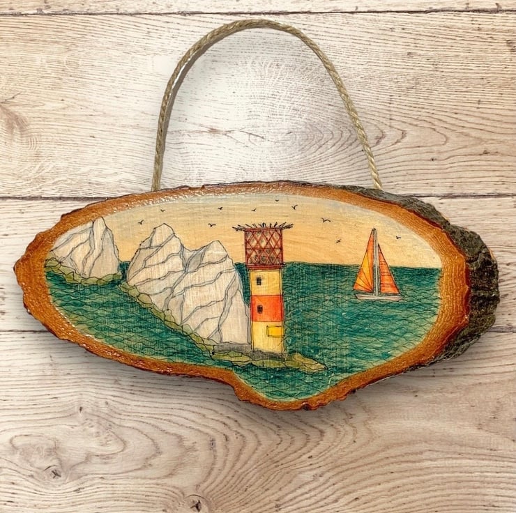 Hand-drawn Isle of Wight scene on a natural wood slice featuring the iconic The Needles rock formation and lighthouse off the coast of the island with a brightly coloured sailboat sailing past.