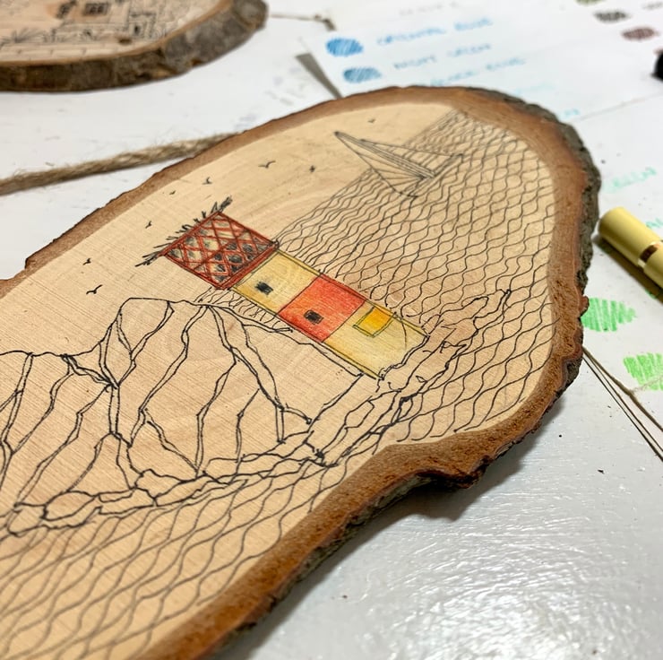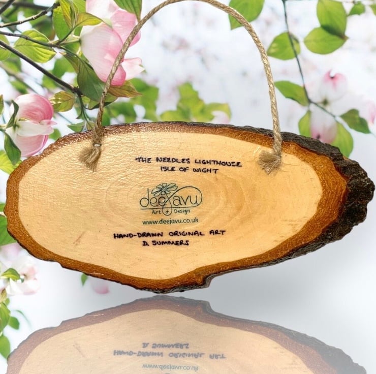 Hand-drawn in ink and coloured pencil on a natural wood slice, the artwork has been varnished to give a beautiful sheen. The artwork is stamped on the back with the artists logo to indicate that it is a one-of-a-kind original work of art (you can see the back of the hanging in the photograph). The wooden hanging measures approximately 18 x 10cm.