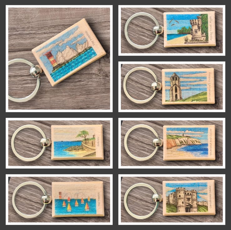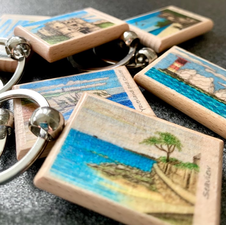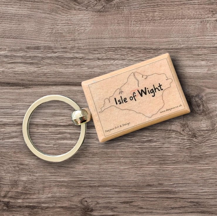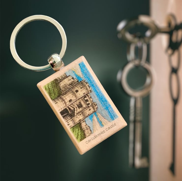 Isle of Wight keyring featuring Carisbrooke Castle on the Isle of Wight, UK. The keyring is made from solid wood with a silver coloured split ring attached. It is decorated with my original ink and pencil drawing of the castle. The back of the keyring has an outline of the Isle of Wight with a small red heart to indicate the location of Carisbrooke Castle on the Island. The decoupaged artwork is varnish for protection.