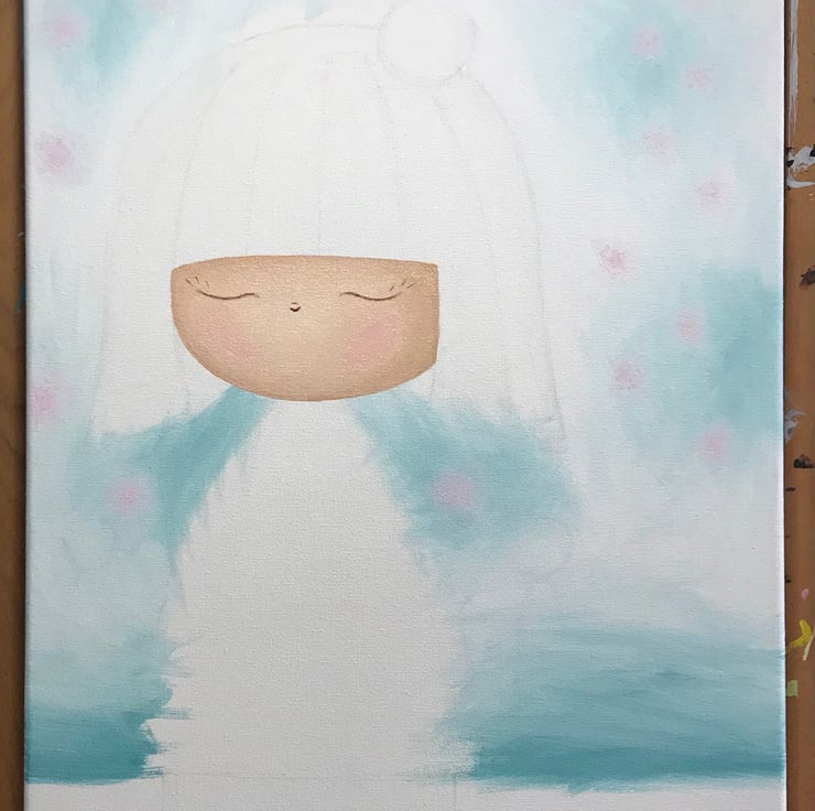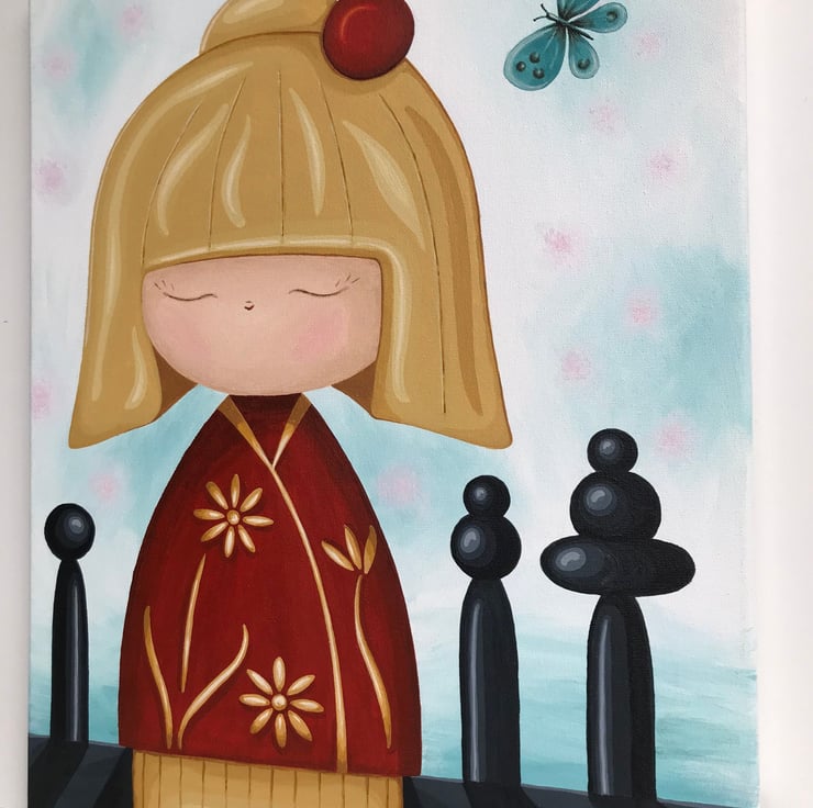 This eye-catching painting features a pretty Japanese Kokeshi Doll standing amongst sculptures that represent Japanese balancing stones. The doll is dressed in a bright red outfit with flower details and light coloured hair. The background of this sweet painting is painted in shades of white and pale blue with small pink details that represent pretty cherry blossom against the sky and includes a single blue butterfly. This painting has an air of calmness and has been named 'Serenity'.