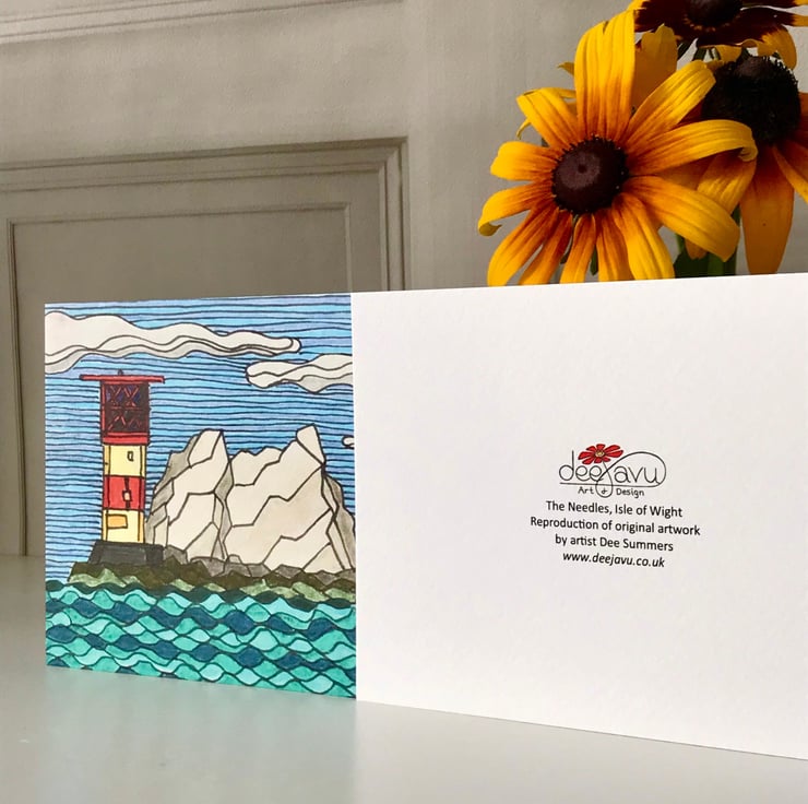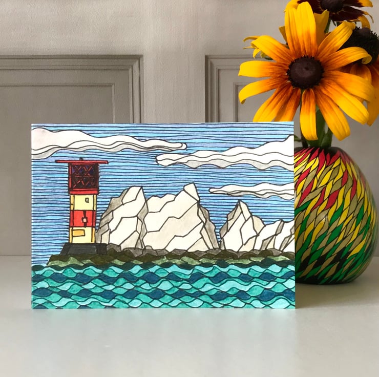 The Needles Isle of Wight art print greetings card. This card is a print of one of my original Isle of Wight drawings. The card measure 21 x 15 cm (A6), with the image printed on thick 300gsm Tintoretto card that has a 'hammered' texture that creates a quality print. It is blank inside for you to add your own message. The card comes with a quality envelope and will be sealed in a cellophane wrap and posted in a card backed envelope for protection.