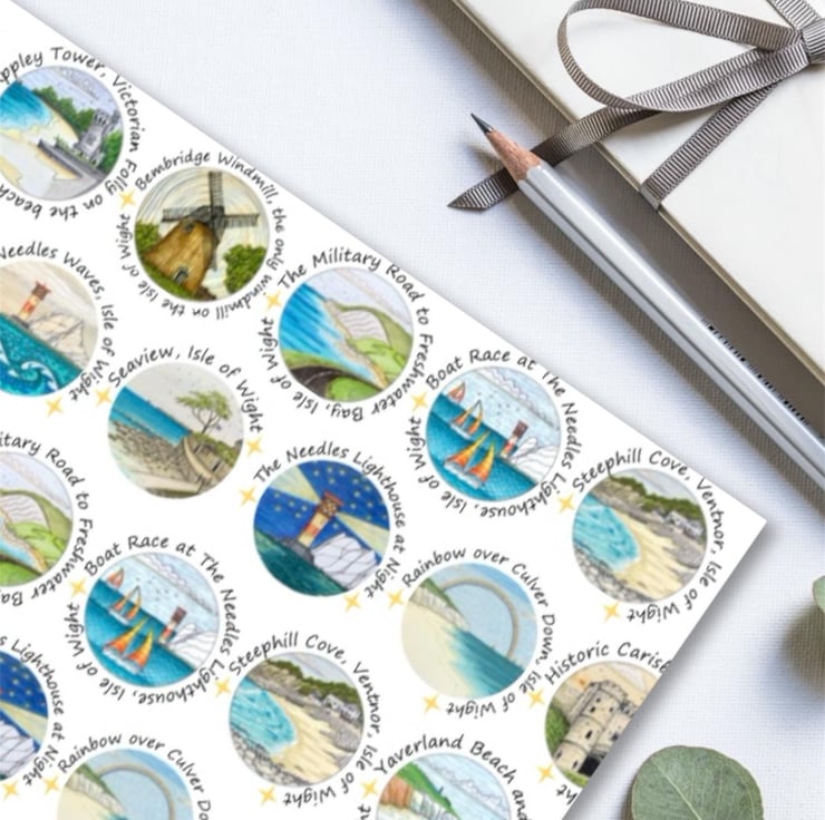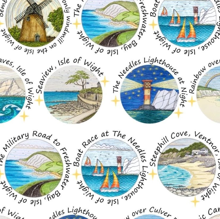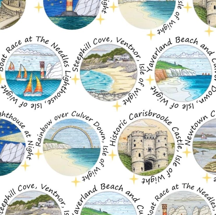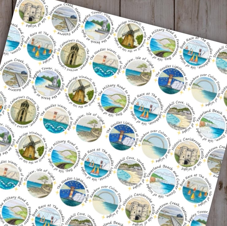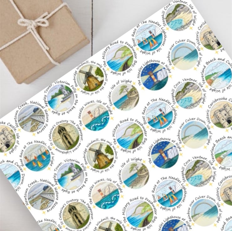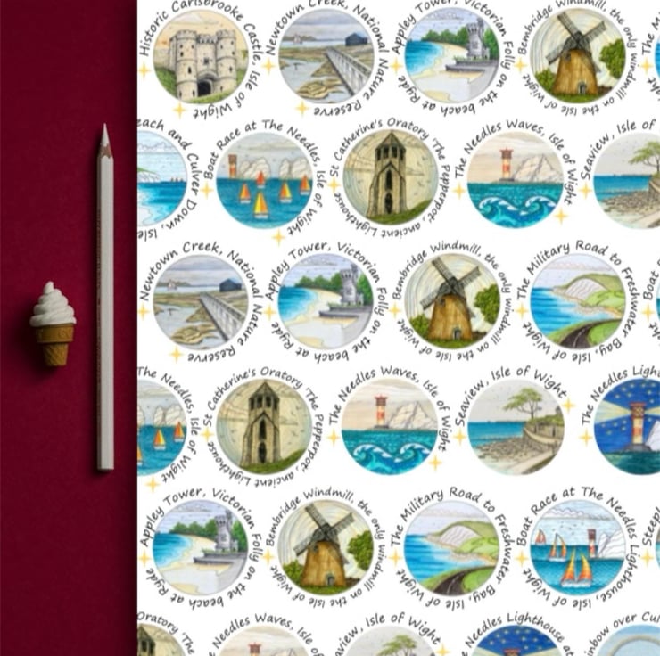 Isle of Wight art print wrapping paper featuring my original ink and pencil drawings. This quality wrapping paper features 14 different drawings of Isle of Wight landmarks, including The Needles, Appley Tower, Culver Down, Newtown Creek, Bembridge Windmill and The Pepperpot.