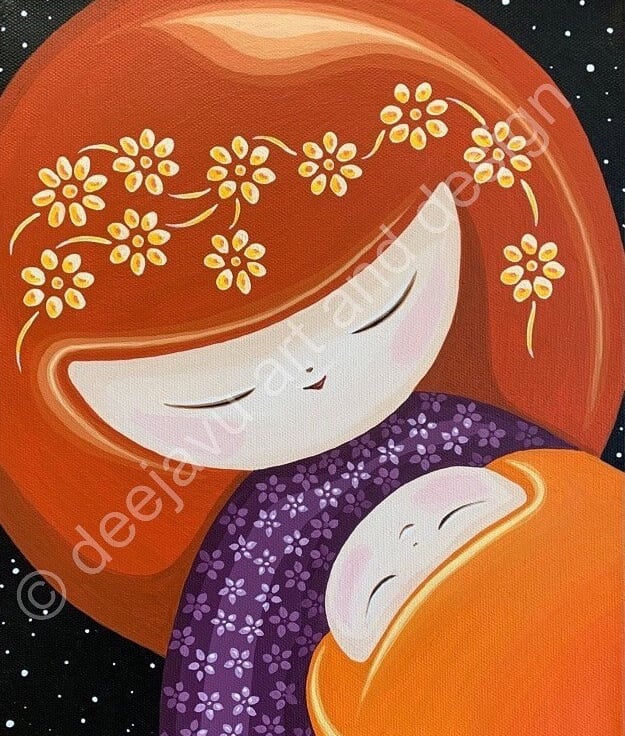 This pretty and eye-catching painting represents the love between a parent and child. Both figures have orange hair and the parent is dressed in purple with flower decorations. The background is painted black with small white dots representing stars in the night sky. The edges of the canvas are painted so that the artwork is ready to hang without the need to be framed.