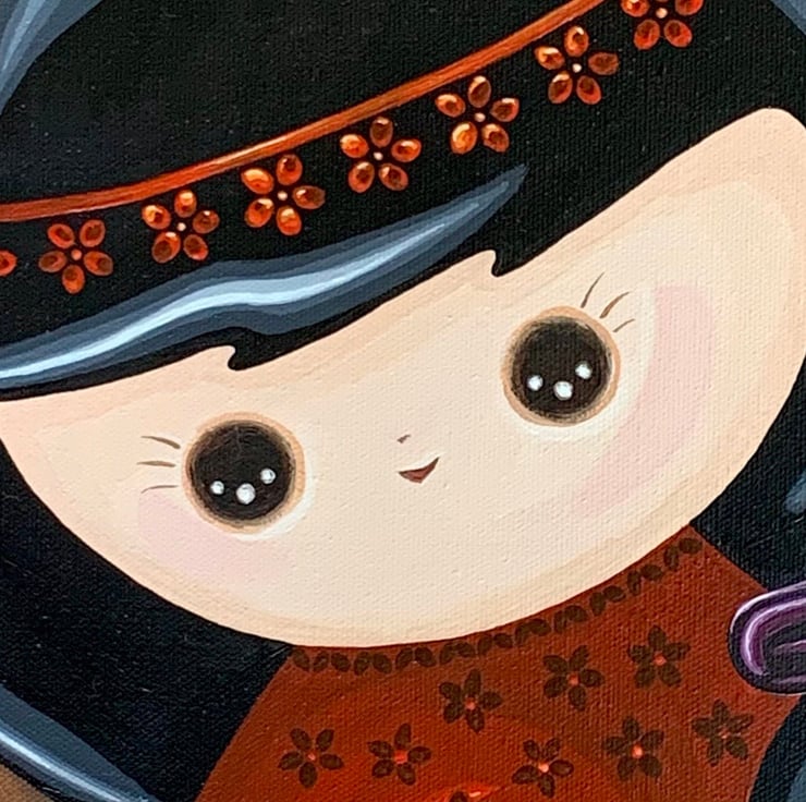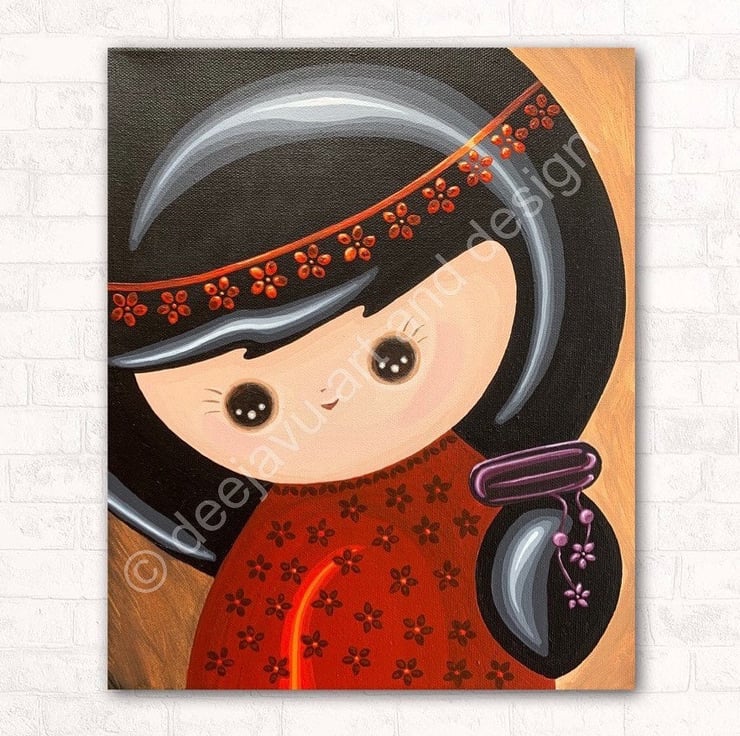 This eye-catching painting features a pretty Japanese Kokeshi doll with black hair and wide eyes. Her red dress is decorated with black flowers and she has a red flower band in her hair. The edges of the canvas are painted so that the artwork is ready to hang without the need to be framed.