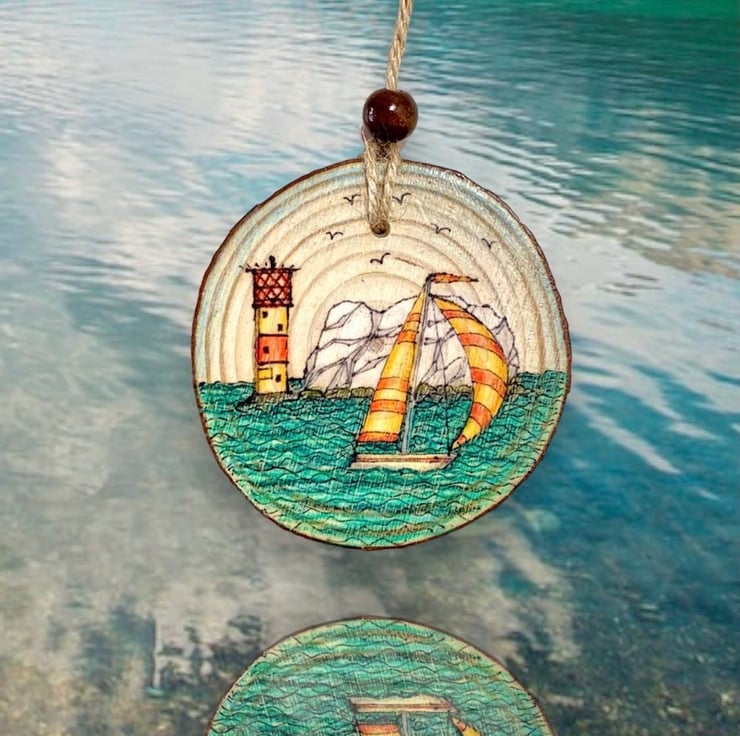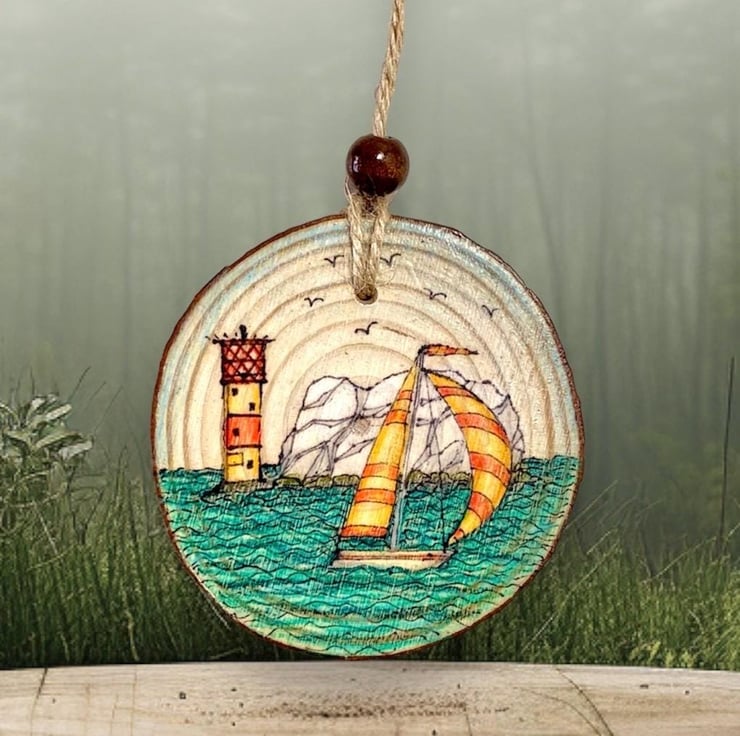 Hand-drawn Isle of Wight scene on a natural wood slice featuring the iconic The Needles rock formation and lighthouse with a brightly coloured sailboat sailing past.