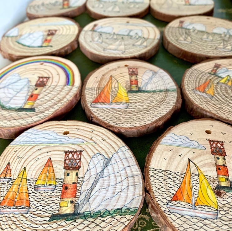 The Isle of Wight is a stunning location where I am lucky enough to live. I have created many Isle of Wight artworks in my own unique art style, you can see a small selection of these in the photograph featuring some of my other wood slices. Please note this listing is for the single artwork featured.