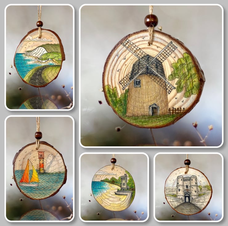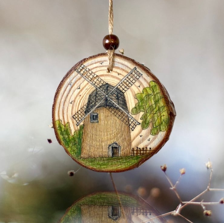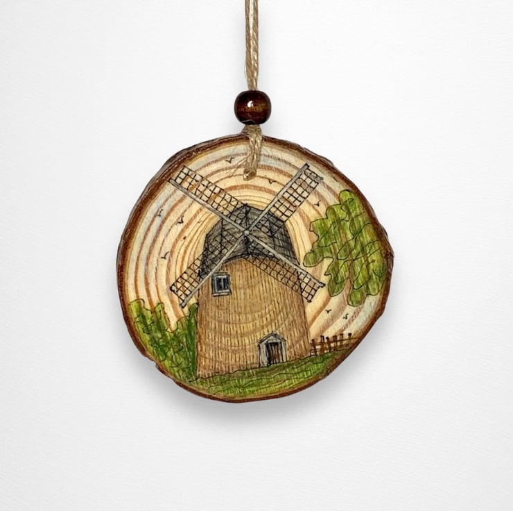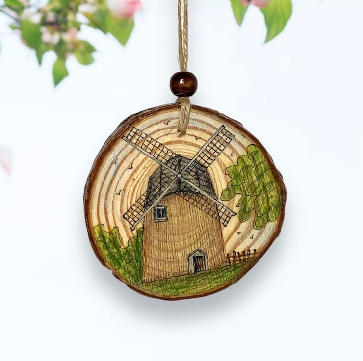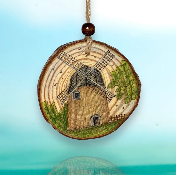 Hand-drawn Isle of Wight scene on a natural wood slice featuring Bembridge Windmill, the only surviving windmill on the beautiful Isle of Wight, UK.