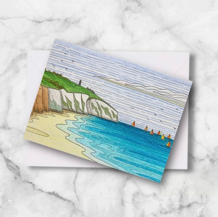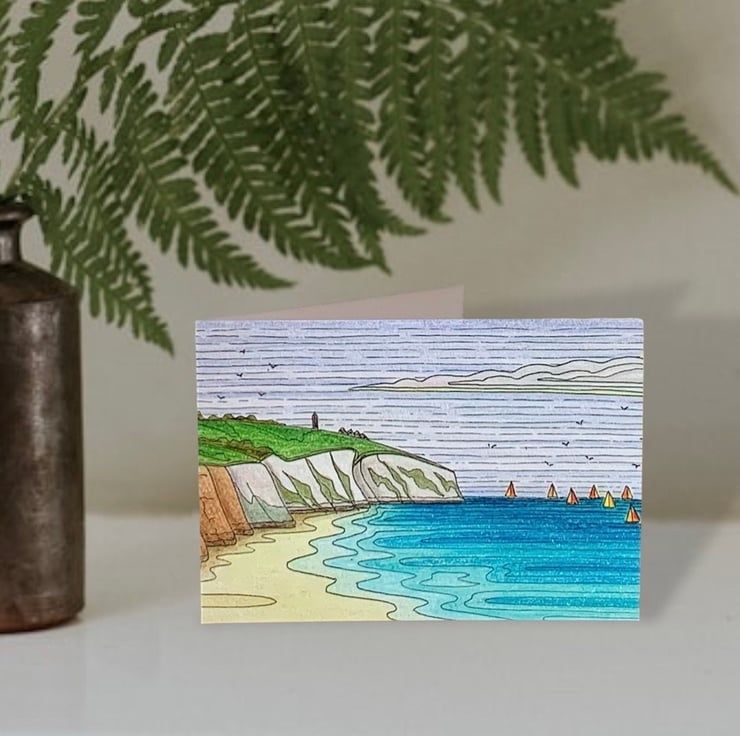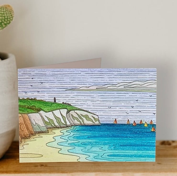 Isle of Wight art print greetings card featuring the stunning sandy beach at Yaverland overlooked by the cliffs of Culver Down with colourful sailboats on the horizon. This unique card is a print of one of my original drawings. The card measures 21 x 15 cm (A6), with the image printed on thick 350gsm Recycled Silk card. It is blank inside for you to add your own message and comes with a white envelope, will be sealed in a cellophane wrap and posted in a card backed envelope for protection.