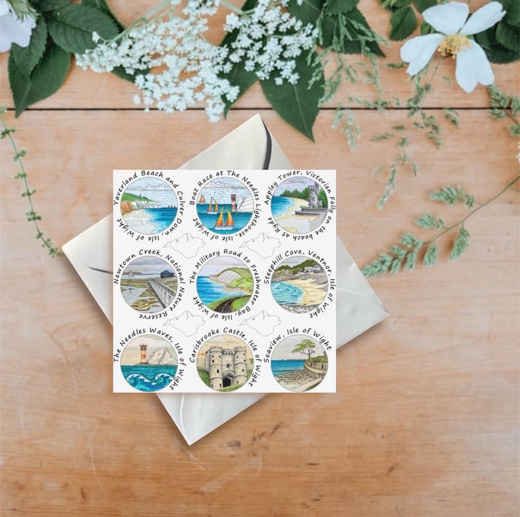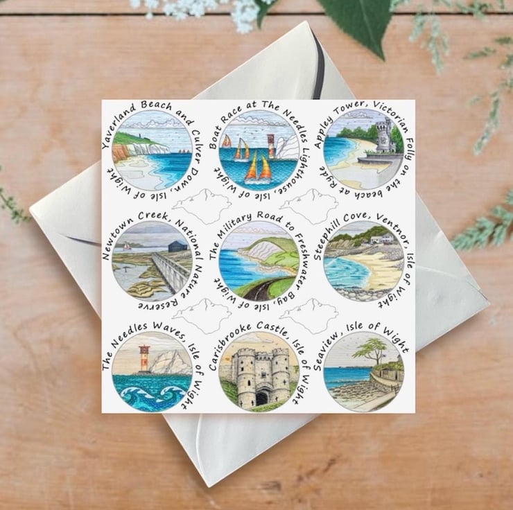 This unique card is a print of my original hand-drawn Isle of Wight artworks. It features iconic Island locations including The Needles Lighthouse, Appley Tower, Yaverland Beach and Culver Down, Newtown Creek, Steephill Cove, The Military Road, Seaview, and Carisbrooke Castle.