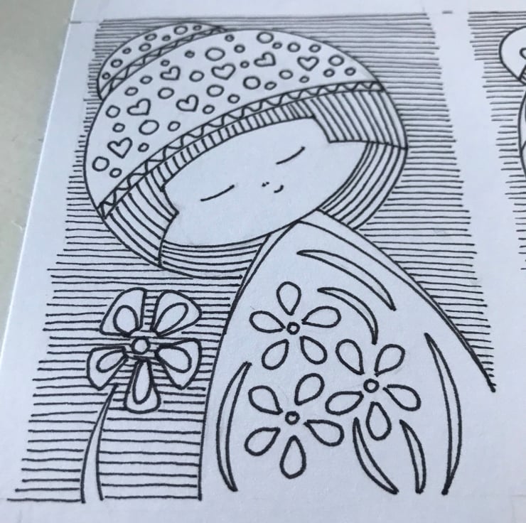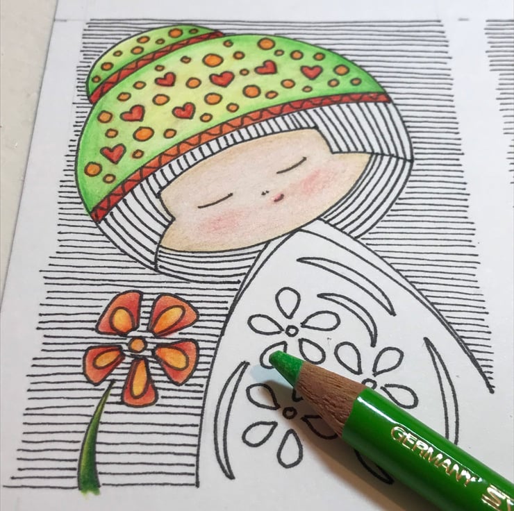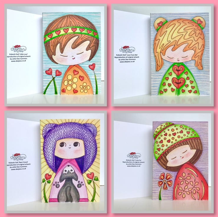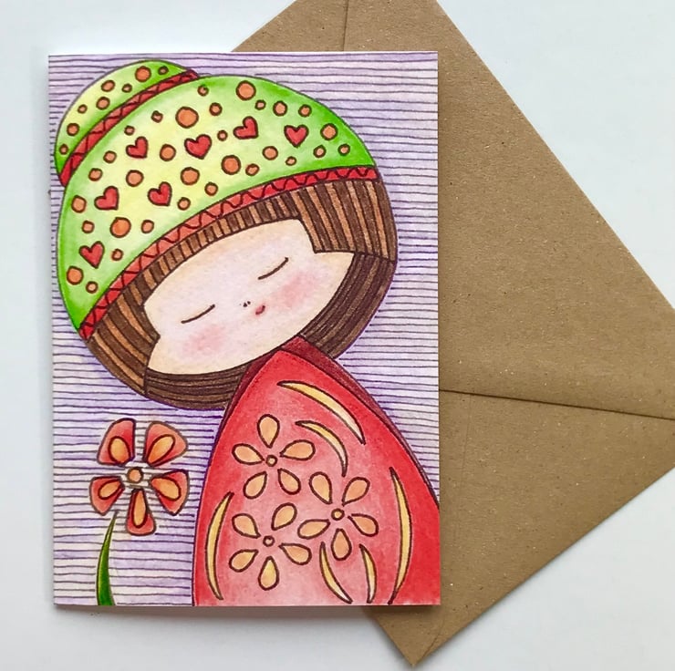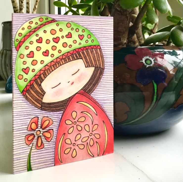 This beautiful bright Kokeshi Doll design is a print of one of my original hand-drawn works of art. Inspired by traditional Japanese Kokeshi doll figures, this greetings card is titled 'Cutie Pie', I hope you agree it is a good name. With cute heart shaped flowers on her hat, this card could be a perfect Valentines, Birthday, Friendship, or just a card to express your love. It is blank inside for you to add your own message.