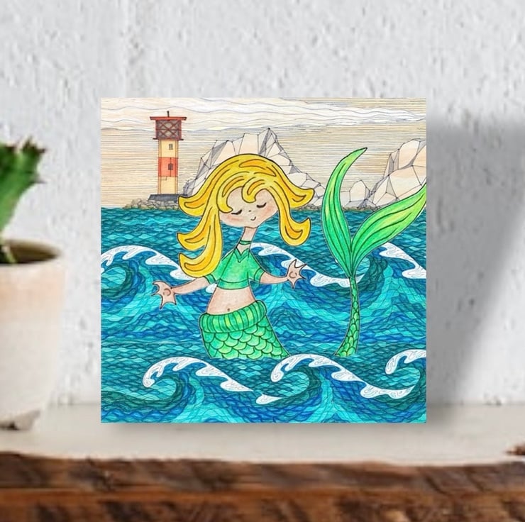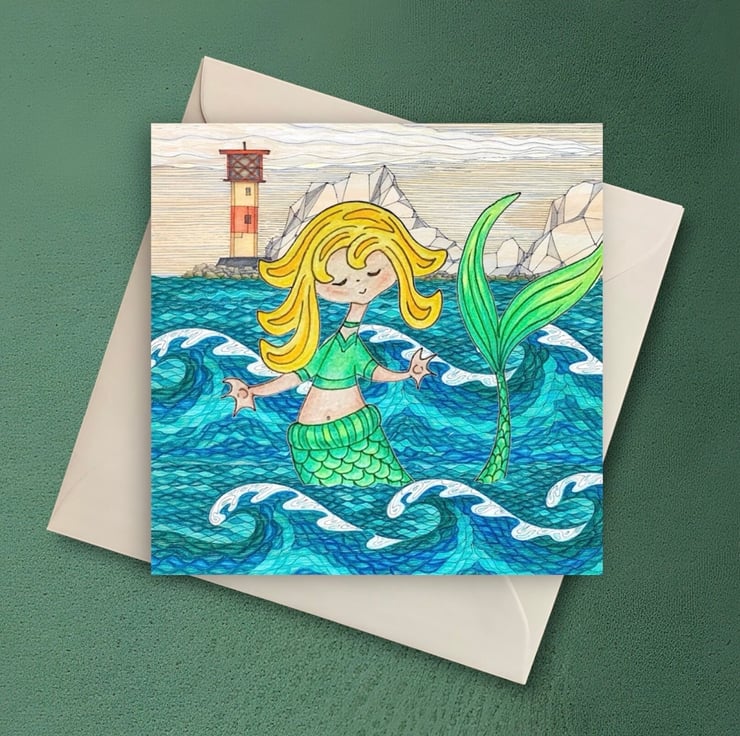 Isle of Wight Greetings Card design featuring a cute mermaid swimming in the sea at The Needles, Isle of Wight. This unique card is a print of my original ink and pencil drawing.