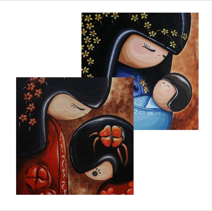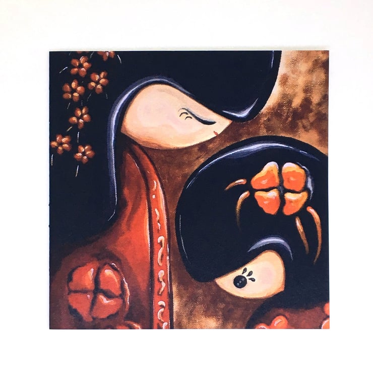 Beautiful reproduction of one of my original acrylic paintings featuring a Japanese Kokeshi Doll depiction of a mother and child.