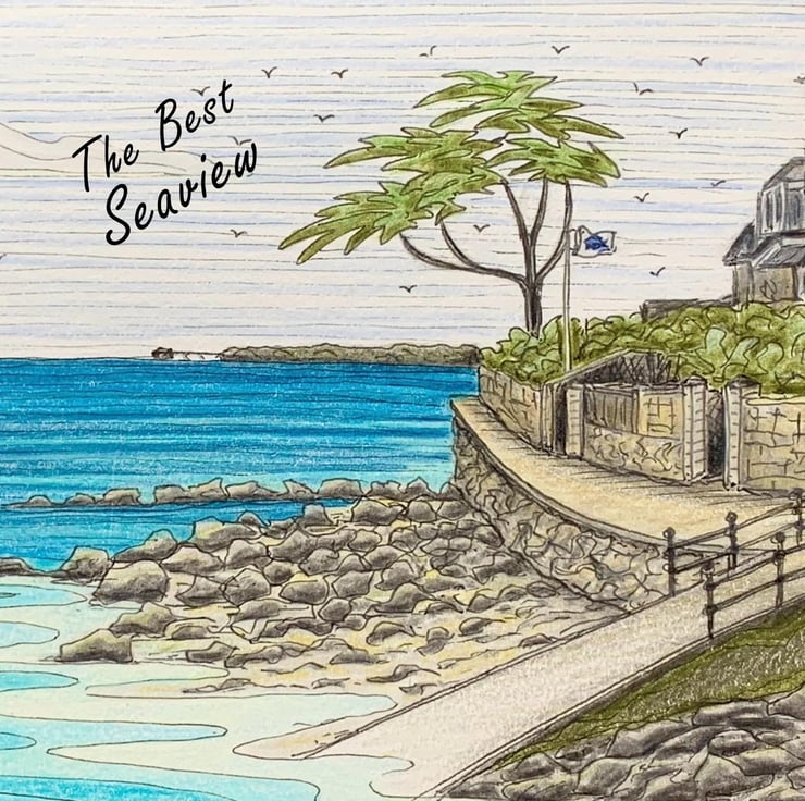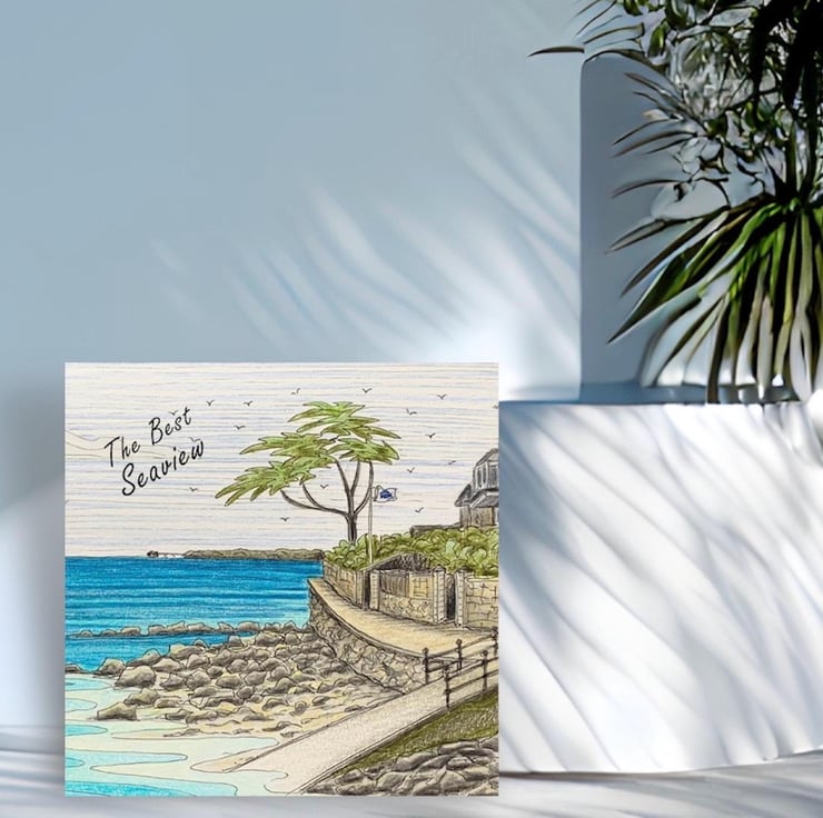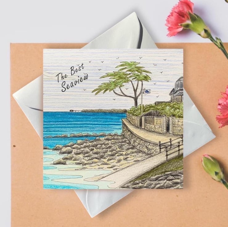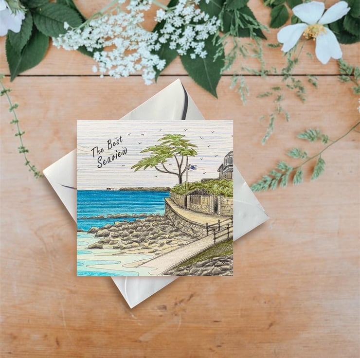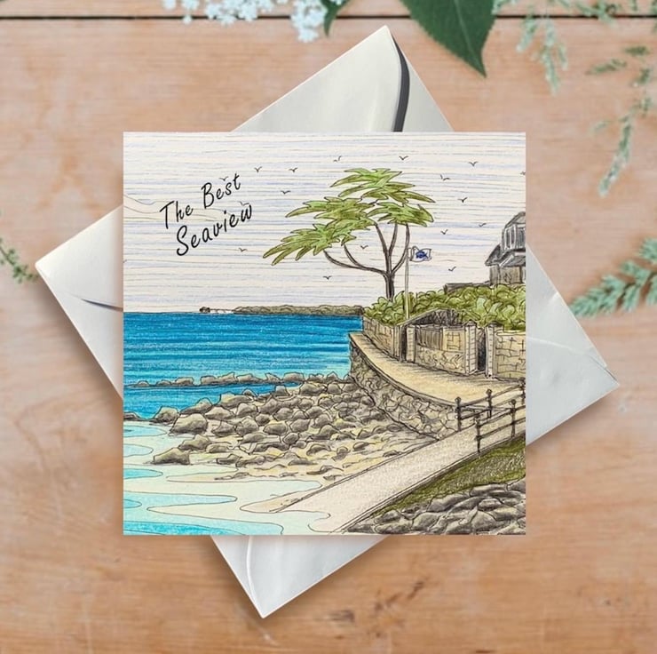 Isle of Wight Greetings Card design featuring the iconic tree on the seafront at Seaview on the Isle of Wight, UK. Printed with the slogan 'The Best Seaview'. This unique card is a print of my original ink and pencil drawing.