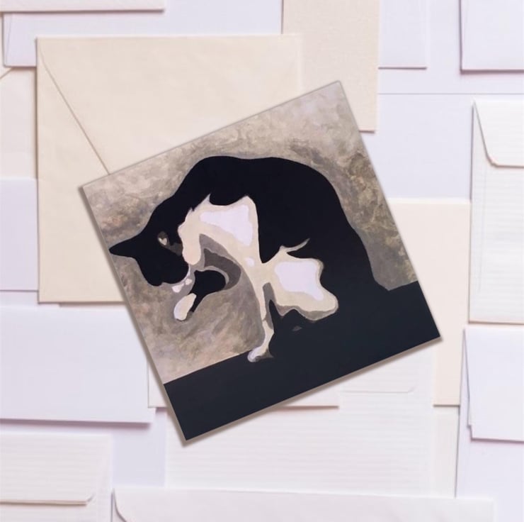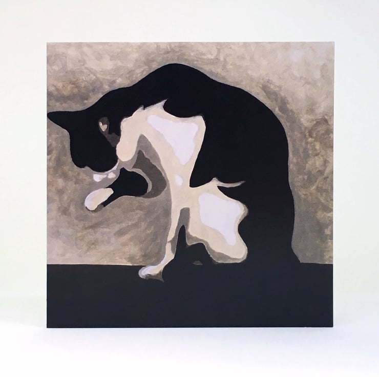 Beautiful art print reproduction of my original canvas painting featuring a cute black and white cat grooming its paw. The card measures 14 x 14 cm and is printed onto thick crisp 350gsm Cocoon RECYCLED matt board and is blank inside for you to add your own message. The card will come with a quality white envelope and sealed in a cellophane wrap and posted in a card backed envelope for protection.