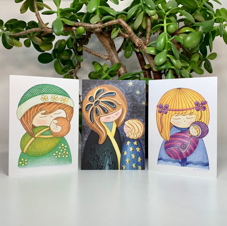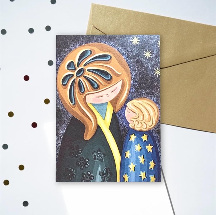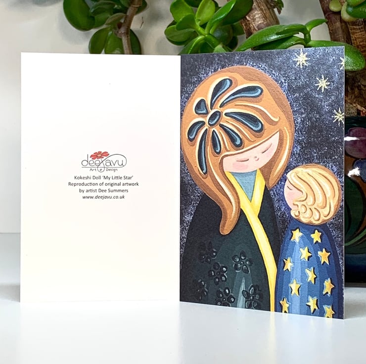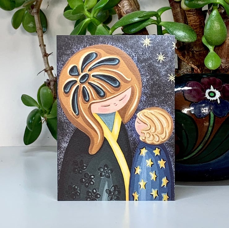 This cute Mother and Child design is a print of one of my original acrylic paintings on canvas. Inspired by traditional Japanese Kokeshi doll figures, this greetings card features a mother and her cute child against a starry night sky. This card could be a perfect Mothers Day, Birthday or just a card to express love. It is blank inside for you to add your own message.