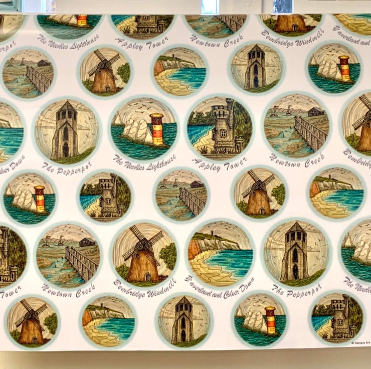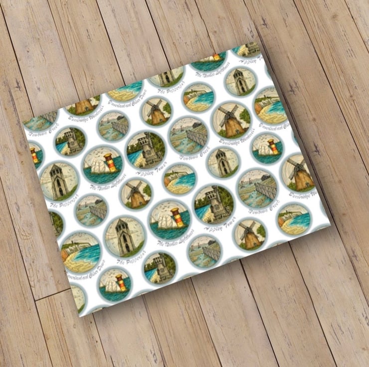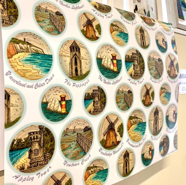 Isle of Wight art print wrapping paper featuring some of my original ink and pencil drawings. This quality wrapping paper features six different original drawings of Isle of Wight landmarks, including The Needles, Appley Tower, Culver Down, Newtown Creek, Bembridge Windmill and The Pepperpot.