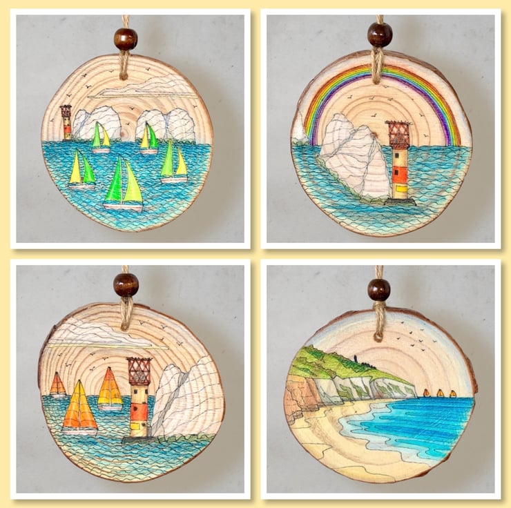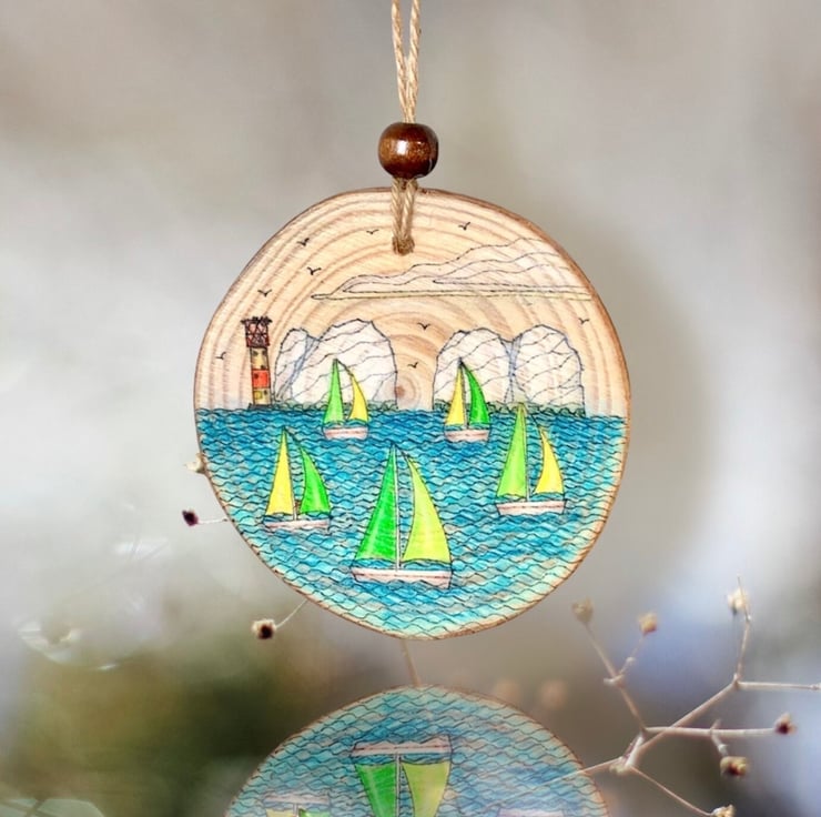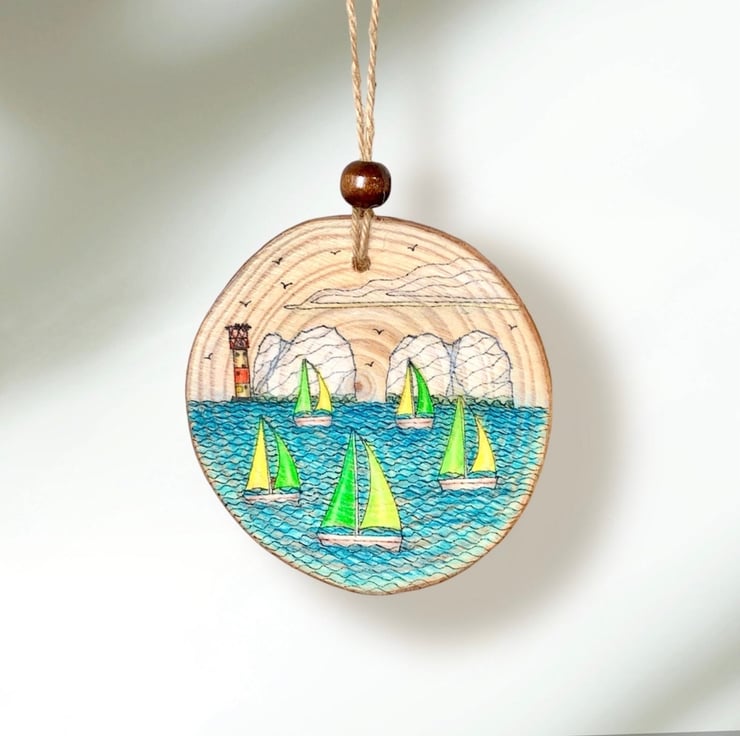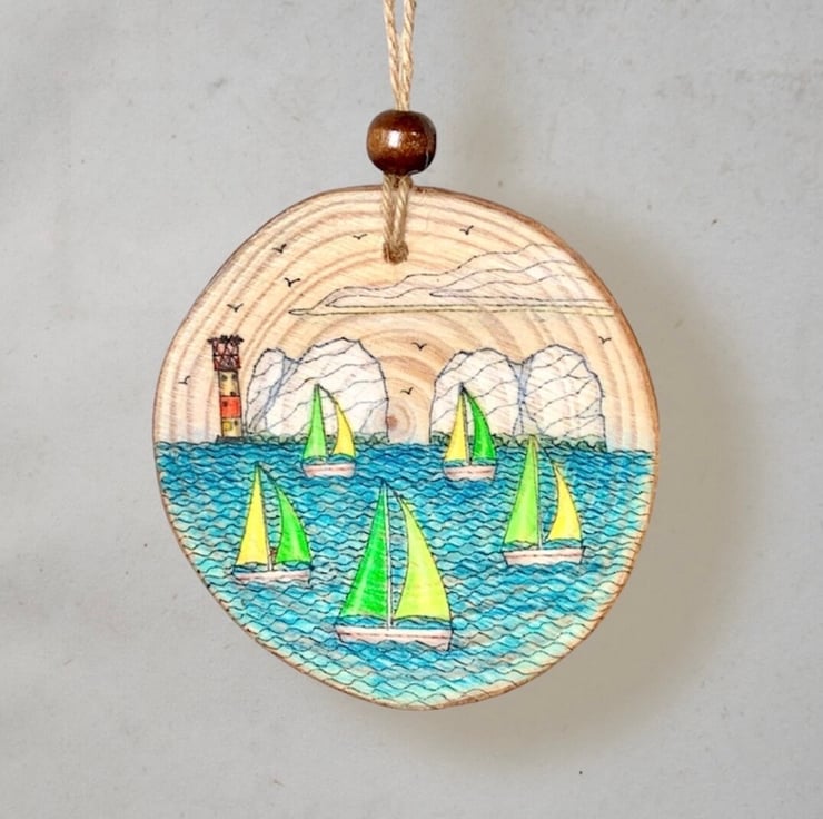 Hand-drawn Isle of Wight scene on a natural wood slice featuring the iconic The Needles rock formation and lighthouse with brightly coloured sailboats sailing past.