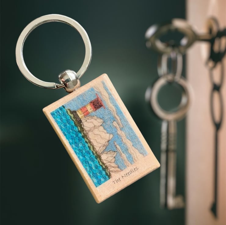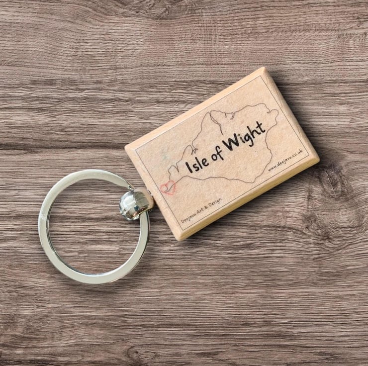 The keyring is made from solid wood with a silver coloured split ring attached. It is hand decorated with a unique art print of one of my original Isle of Wight drawings. The back of the keyring has an outline of the Isle of Wight with a small red heart to indicate the location of The Needles to the west of the Island. The decoupaged artwork is varnish for protection.