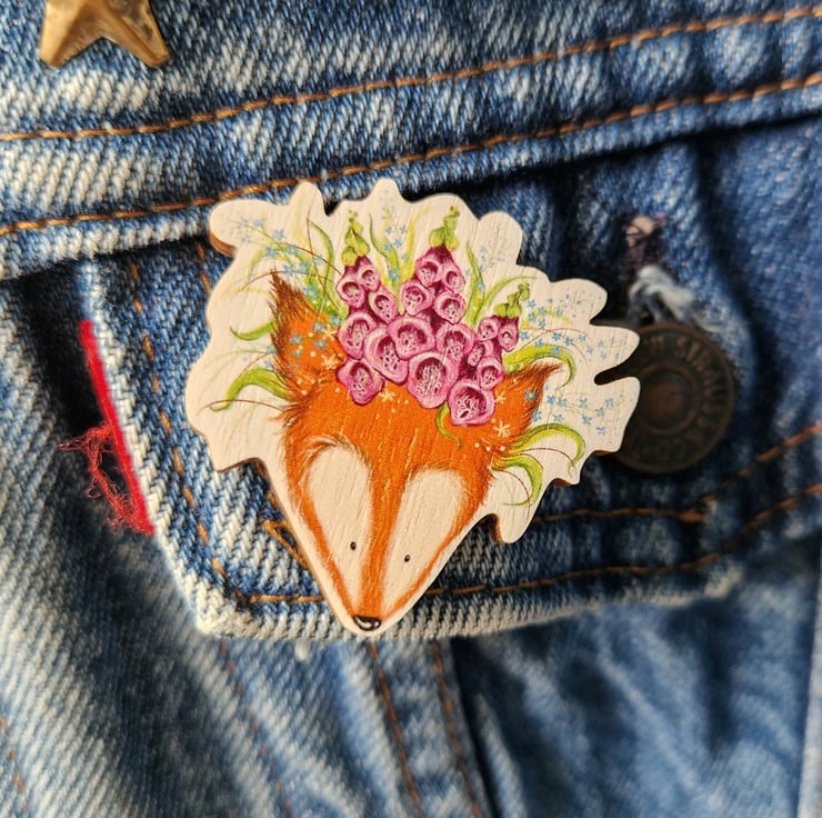 Cute Foxglove Fox, Wooden Pin Badge / Brooch
