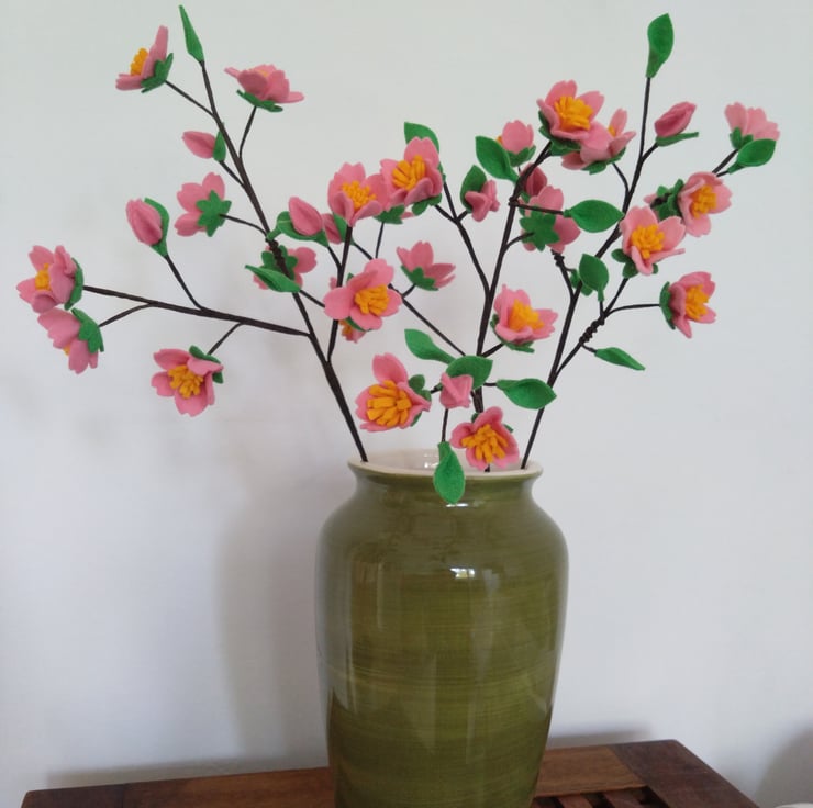 This felt cherry blossom branch has at least nine beautiful blooms and four buds. Each branch is handmade so there is a slight variation, no two branches are the same.