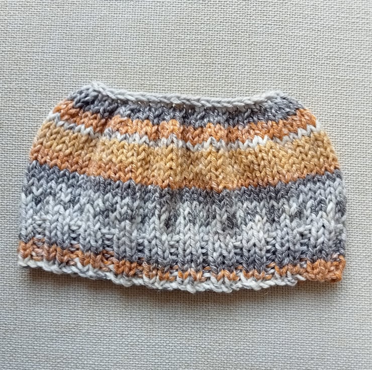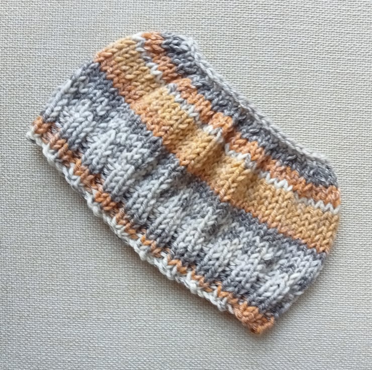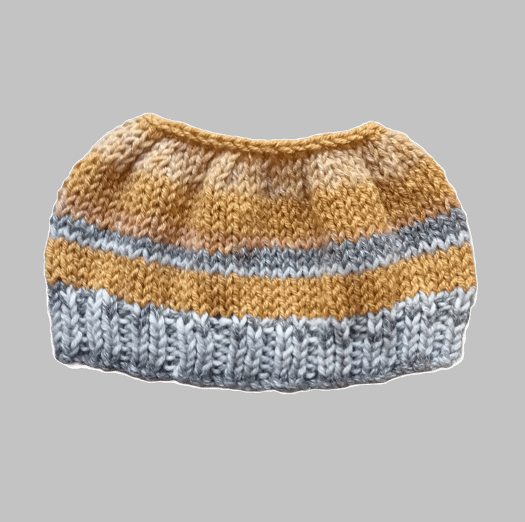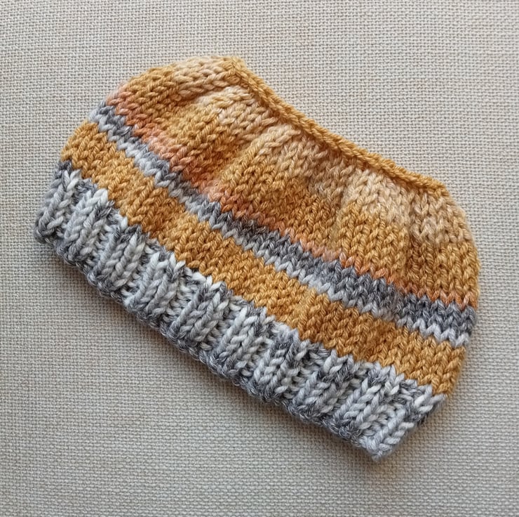 This hand knit PATTERN is for a beanie hat. To fit child (adult). Circumference: 51 (56) cm or 20 (22) inches. The hat is knitted using chunky yarn with 6 mm and 6.5 mm knitting needles. There is a hole for a ponytail or bun. The hat is knit flat and seamed or knit in the round.
