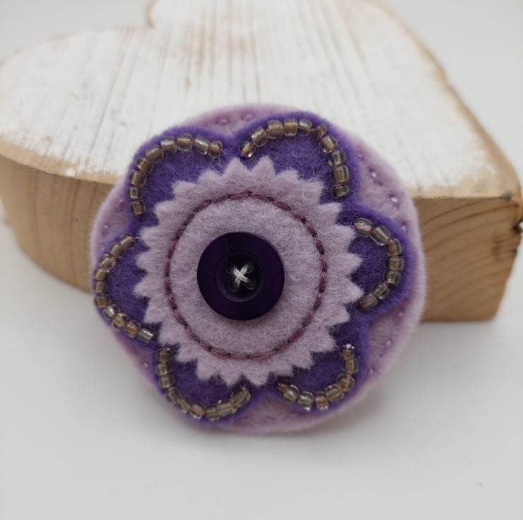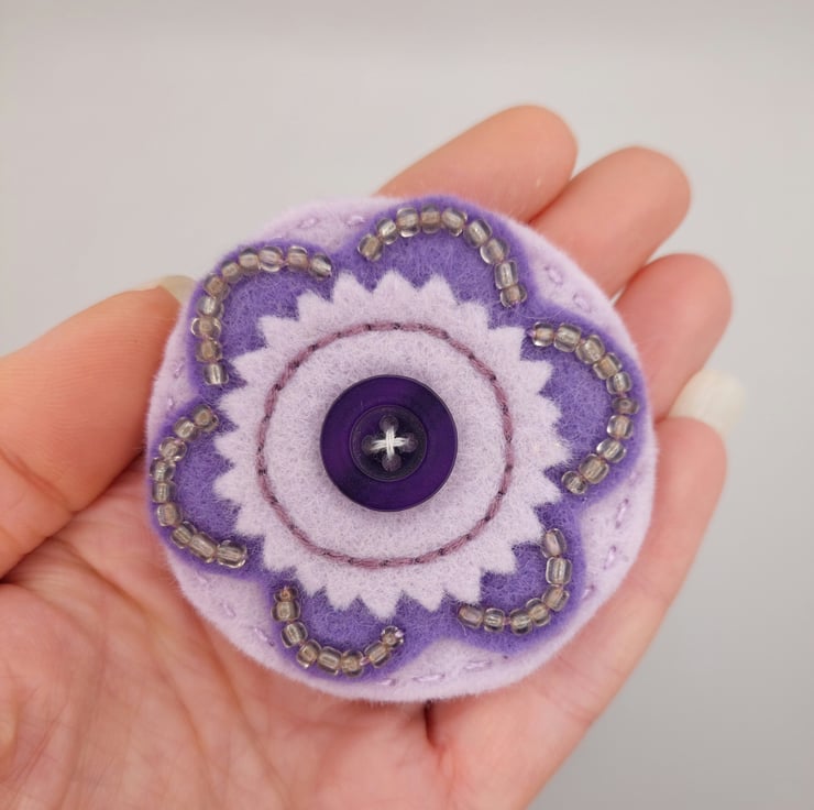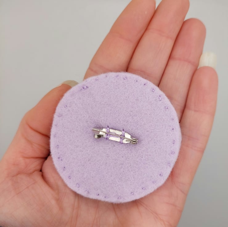 What makes this brooch truly special is the use of recycled beads originally from a necklace, carefully hand-sewn into the design to add subtle sparkle and texture. Each flower is embroidered with lilac thread, and the brooch is finished with a neat handstitched edge. A sturdy metal brooch back ensures it stays securely in place.