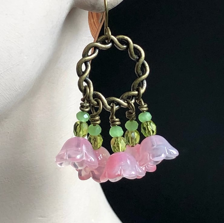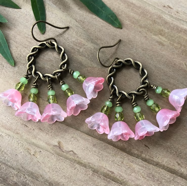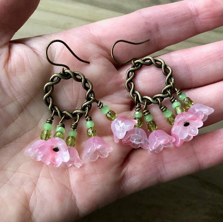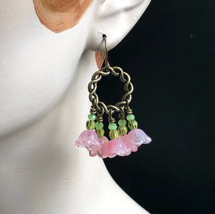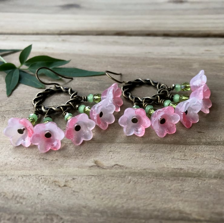 Lovely dangly Boho flower earrings with pink glass flowers and green fire polished glass crystal beads suspended on bronze tone twisted wire rings.