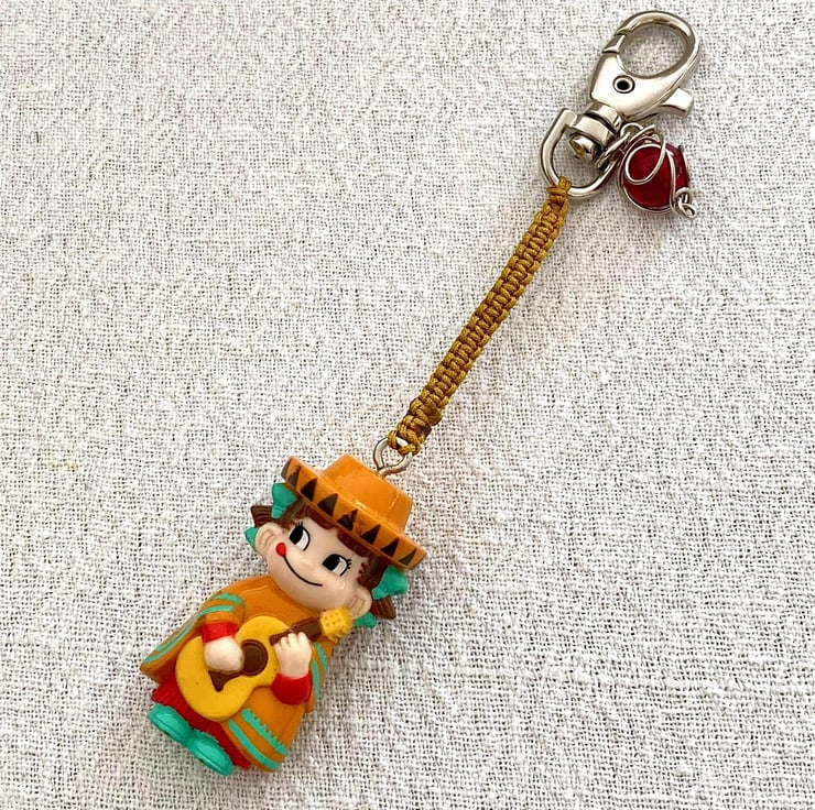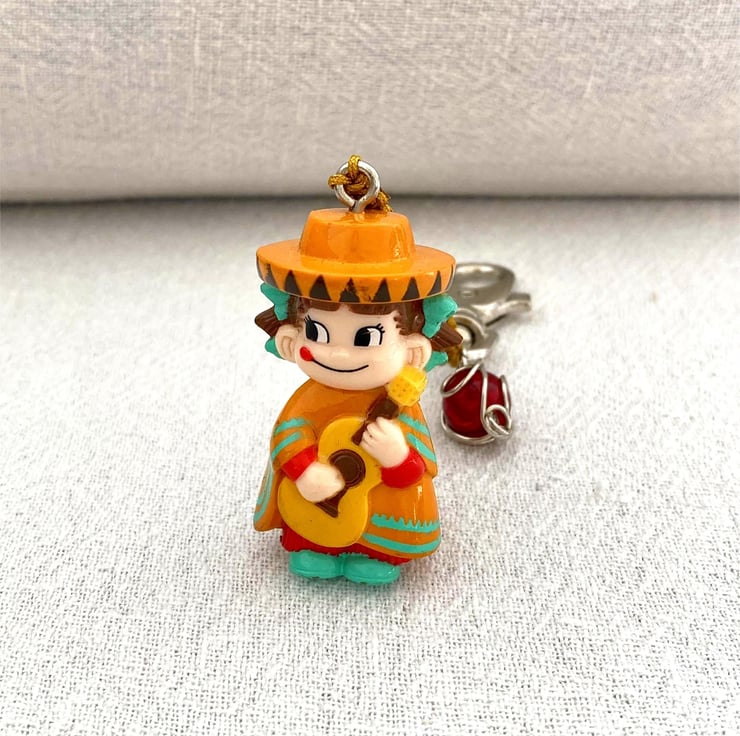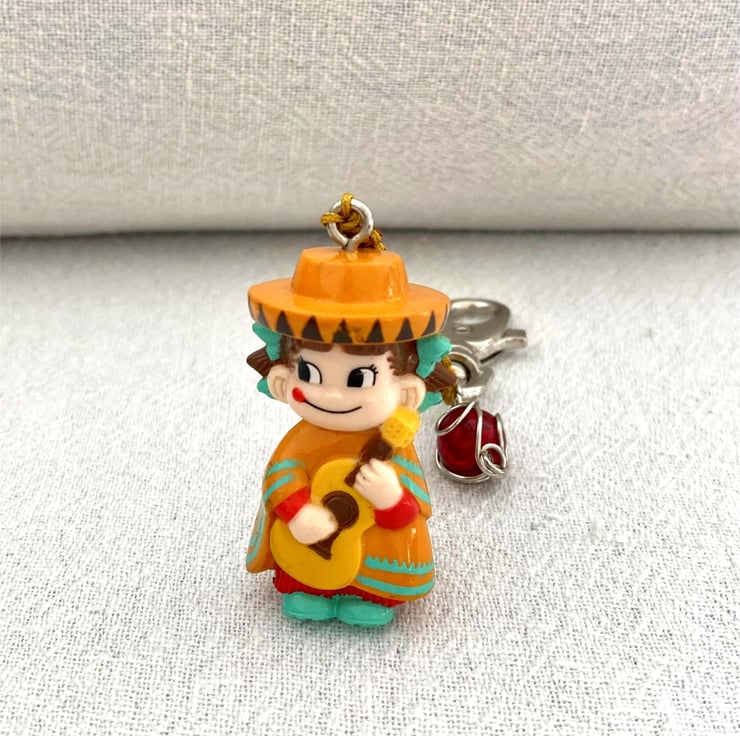 Upcycled Handmade Keychain - Bandai Genuine Gashapon Fujiya Milk Girl In Mexico Costume Peko Keychain - gift for him/her - Unique Gift