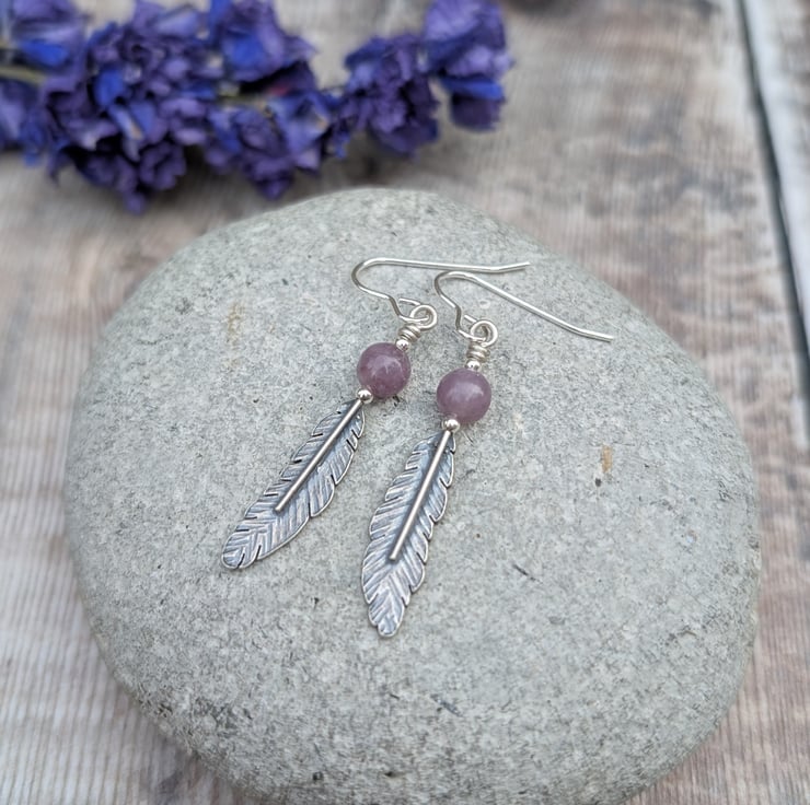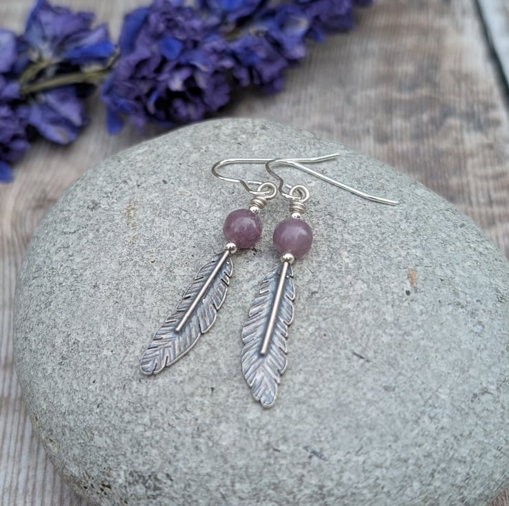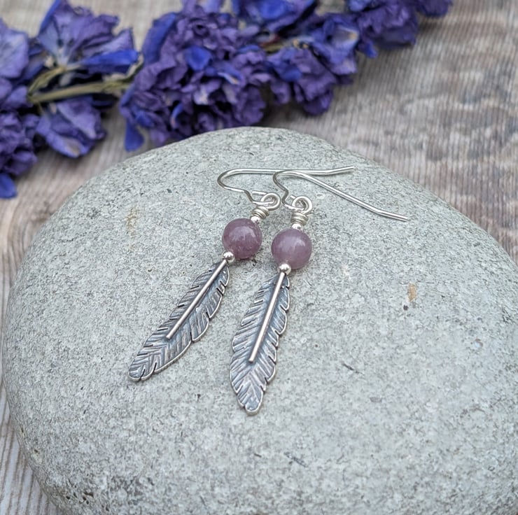 Handmade from recycled sterling silver, these feather drop earrings feature detailed silver feathers paired with soft, lavender amethyst gemstones. The oxidised finish enhances the fine details of the feathers, adding depth and contrast to their intricate texture. The lavender amethyst beads bring a calming touch of natural colour, complementing the organic feel of the design. Suspended from handmade sterling silver ear wires, these earrings are lightweight and comfortable to wear.