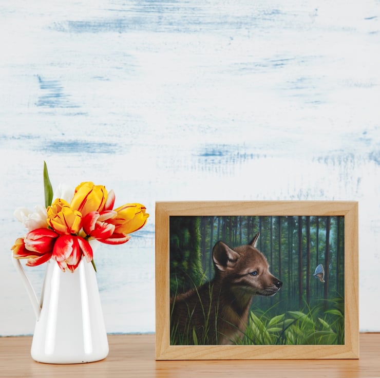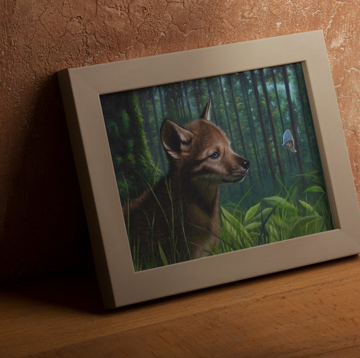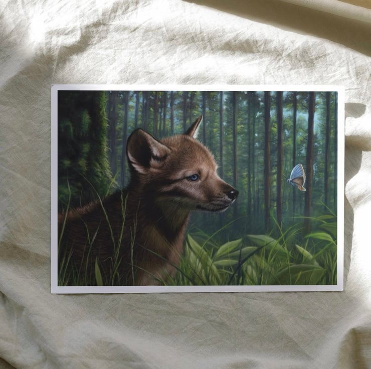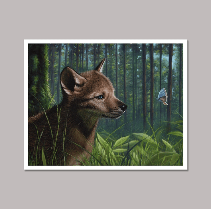 "Our World". A young wolf cub takes it's first tentative steps out into the big world, greeted at once by a butterfly. An image of nature in all it's innocence. This richly detailed artwork will appeal to all animal and nature lovers