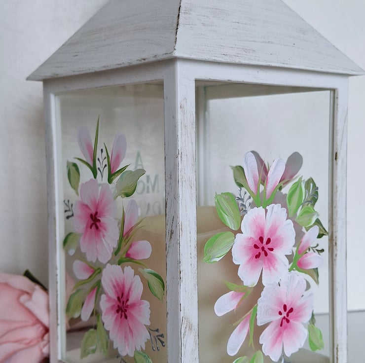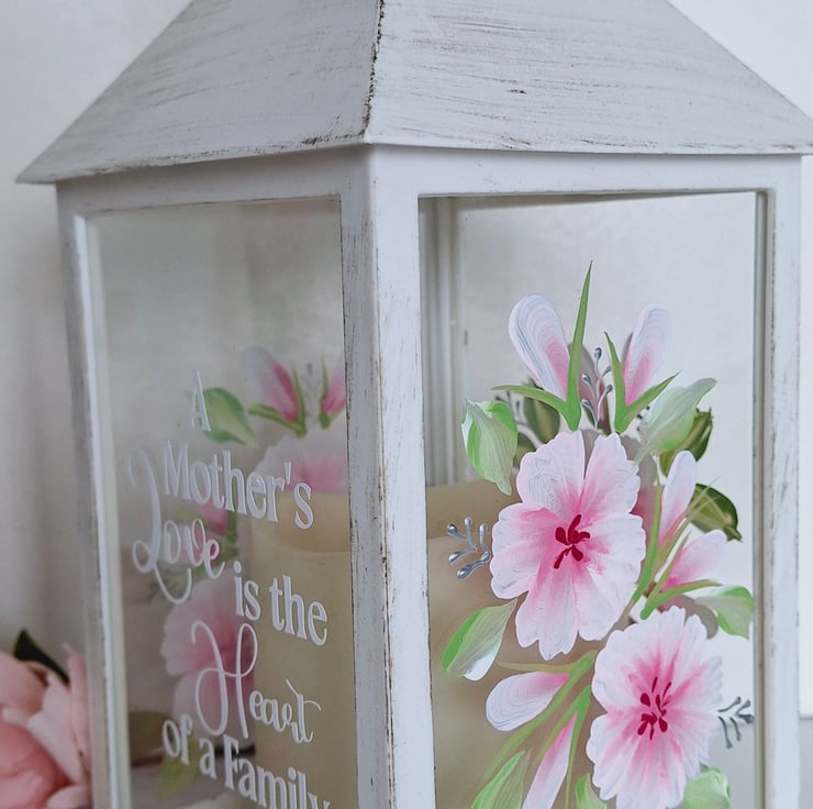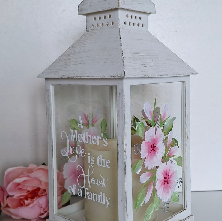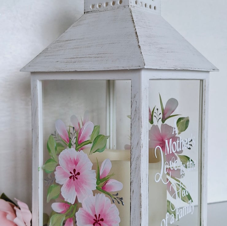 This Ivory distressed effect battery lantern has been hand painted on all 3 sides with a pretty pink floral design. It has a lovely quote on the front about Mum being the heart of a family. A really wonderful gift to treasure.