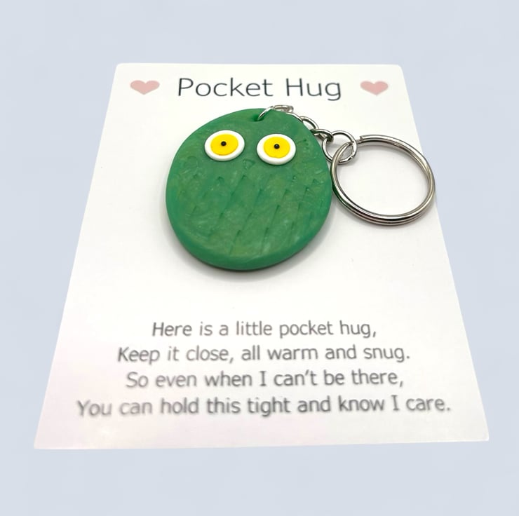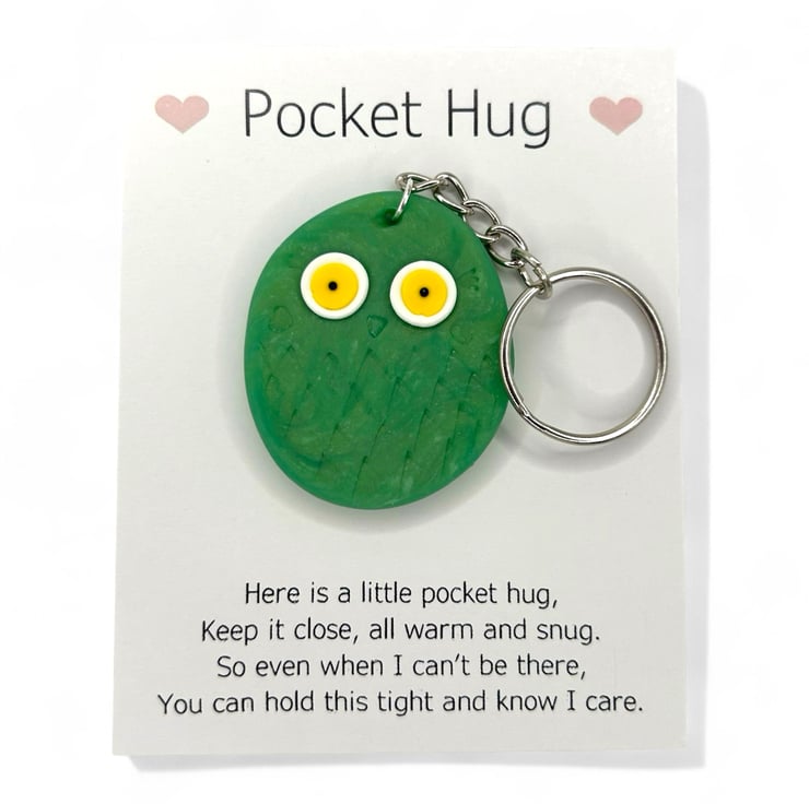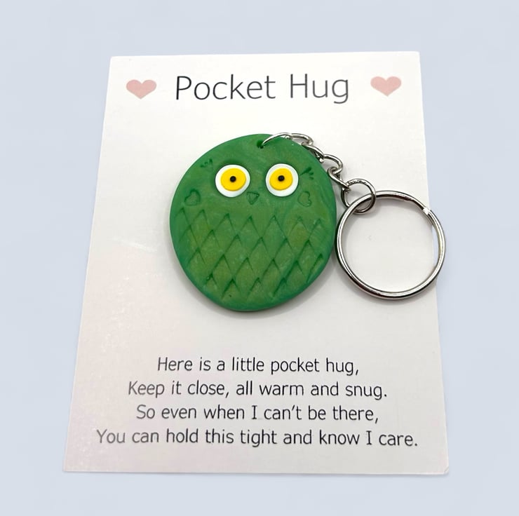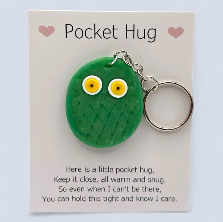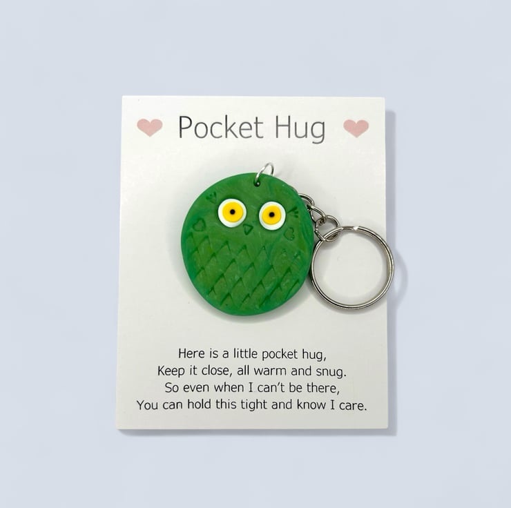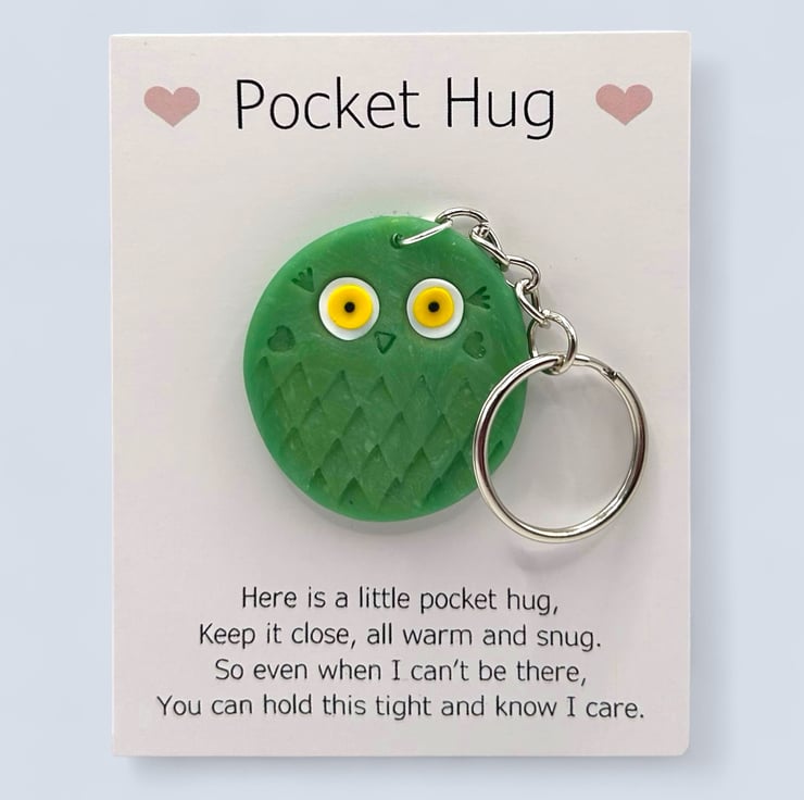 The owl is attached to a card that reads "Pocket Hug" at the top, accompanied by a poem below. It can easily be removed from the card, and the glue dot is simple to peel off. Since each owl is made by hand, no two will be exactly alike, but they will all be irresistibly cute.